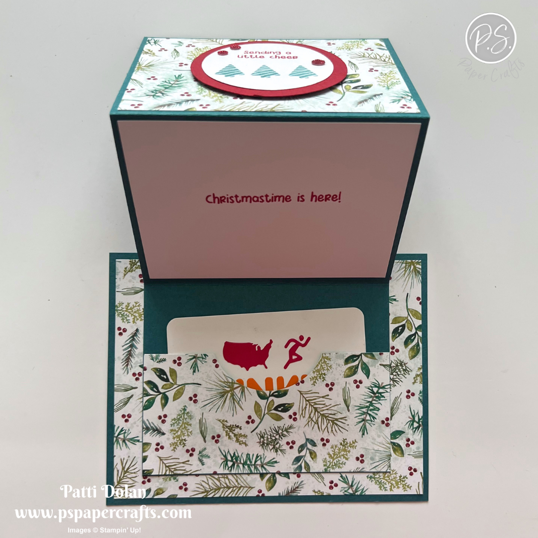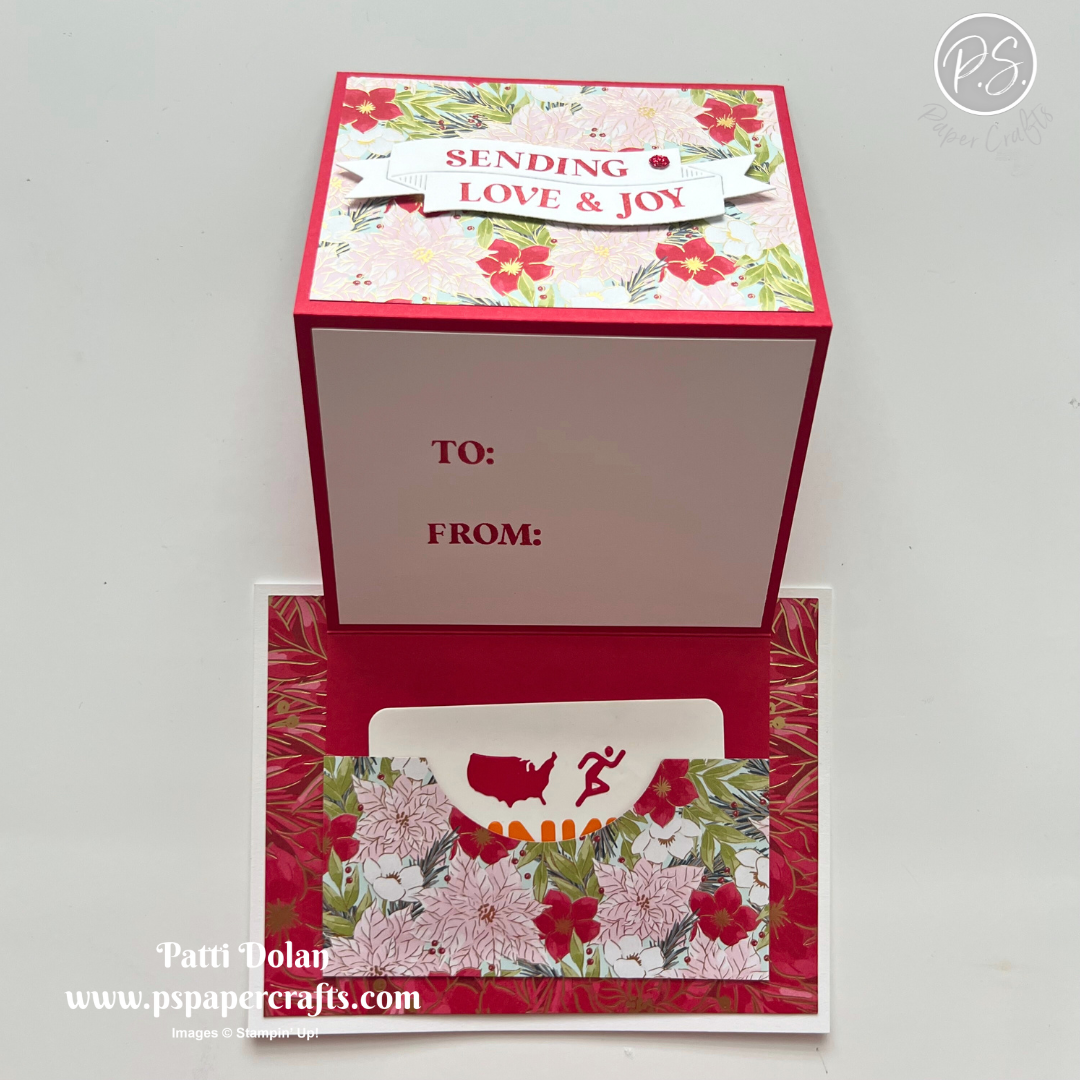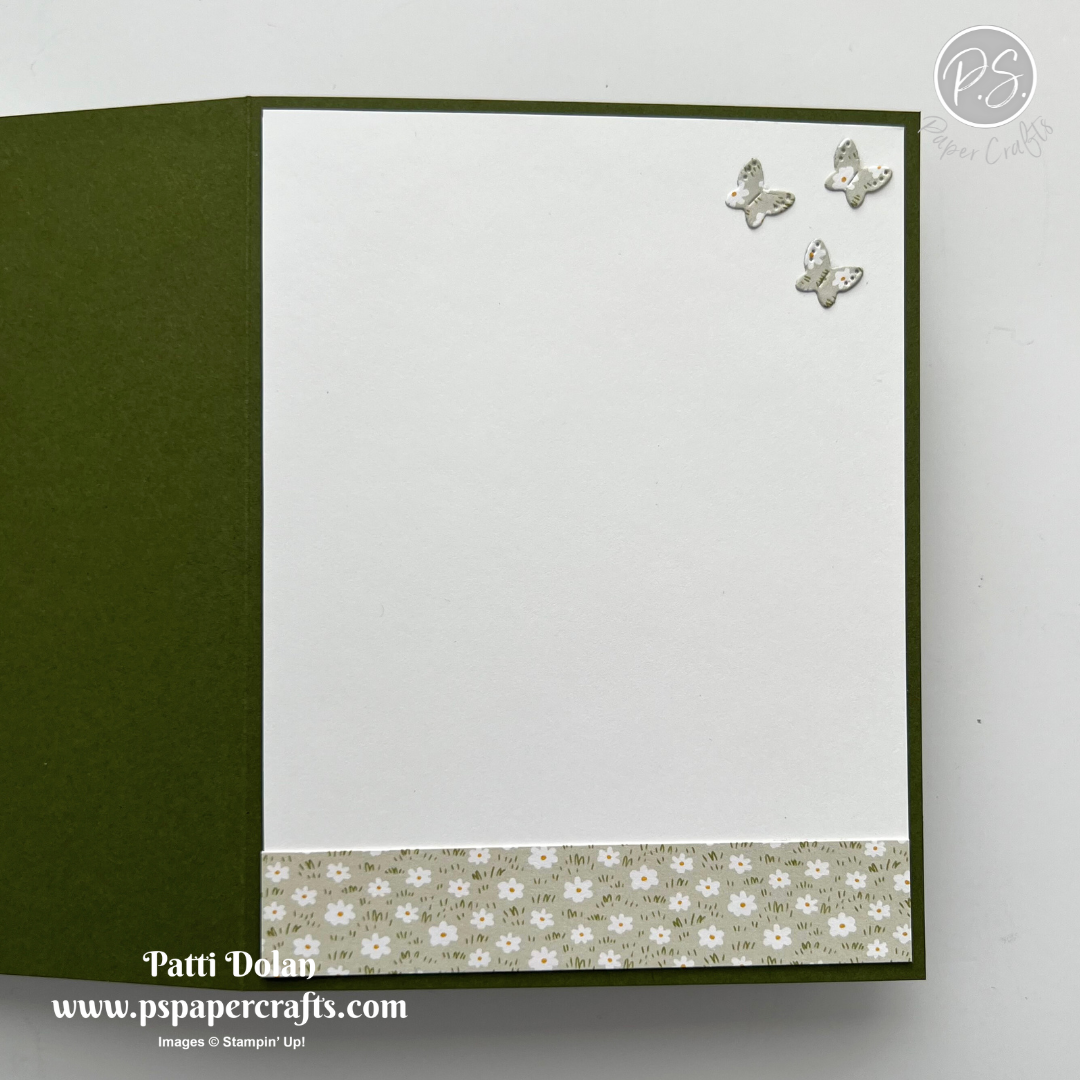 On the inside layer (4 x 5-1/4), add a 3/4” x 4 strip of the Designer Series Paper. Die cut 3 tiny butterflies using the small die that cuts the butterfly, snail and dragonfly in the Sweet Bugs Dies. I just used the butterflies and saved the others for another project. I die cut them from the same paper that I used for the strip.