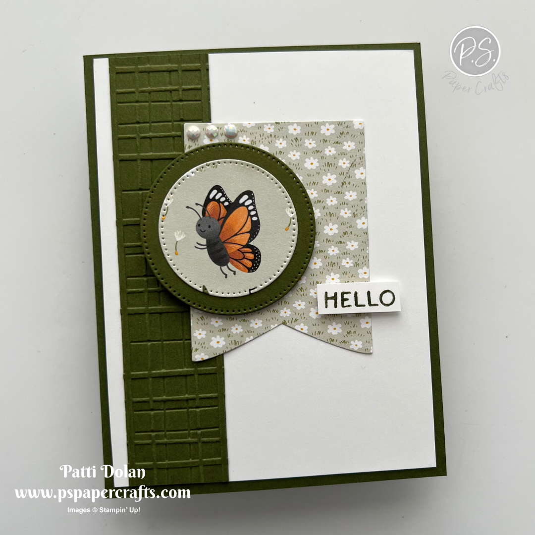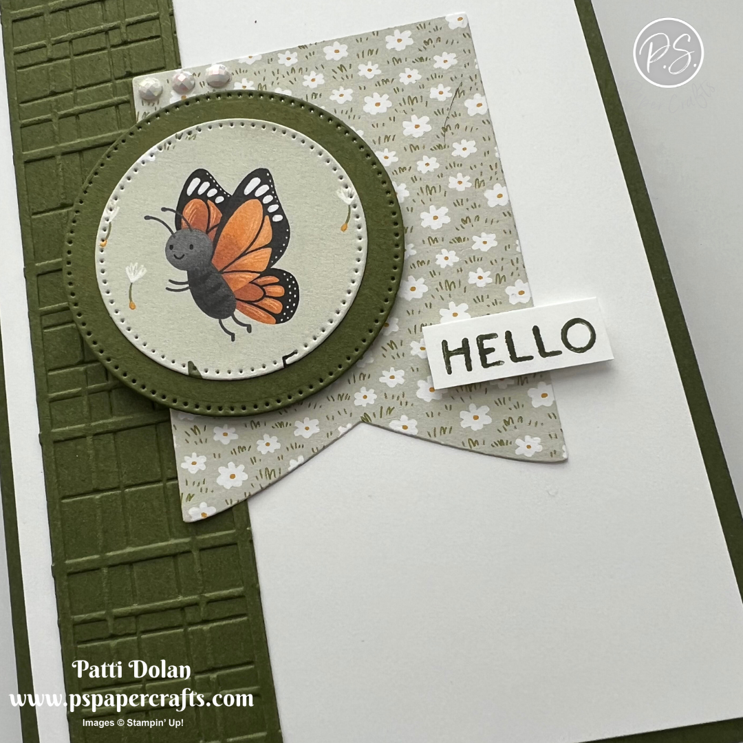 The Cute As A Bug Designer Series Paper is so darn cute! I die cut the butterfly right from the paper using the circle die from the Stylish Shapes Dies and the banner piece using the Party Banner Dies.