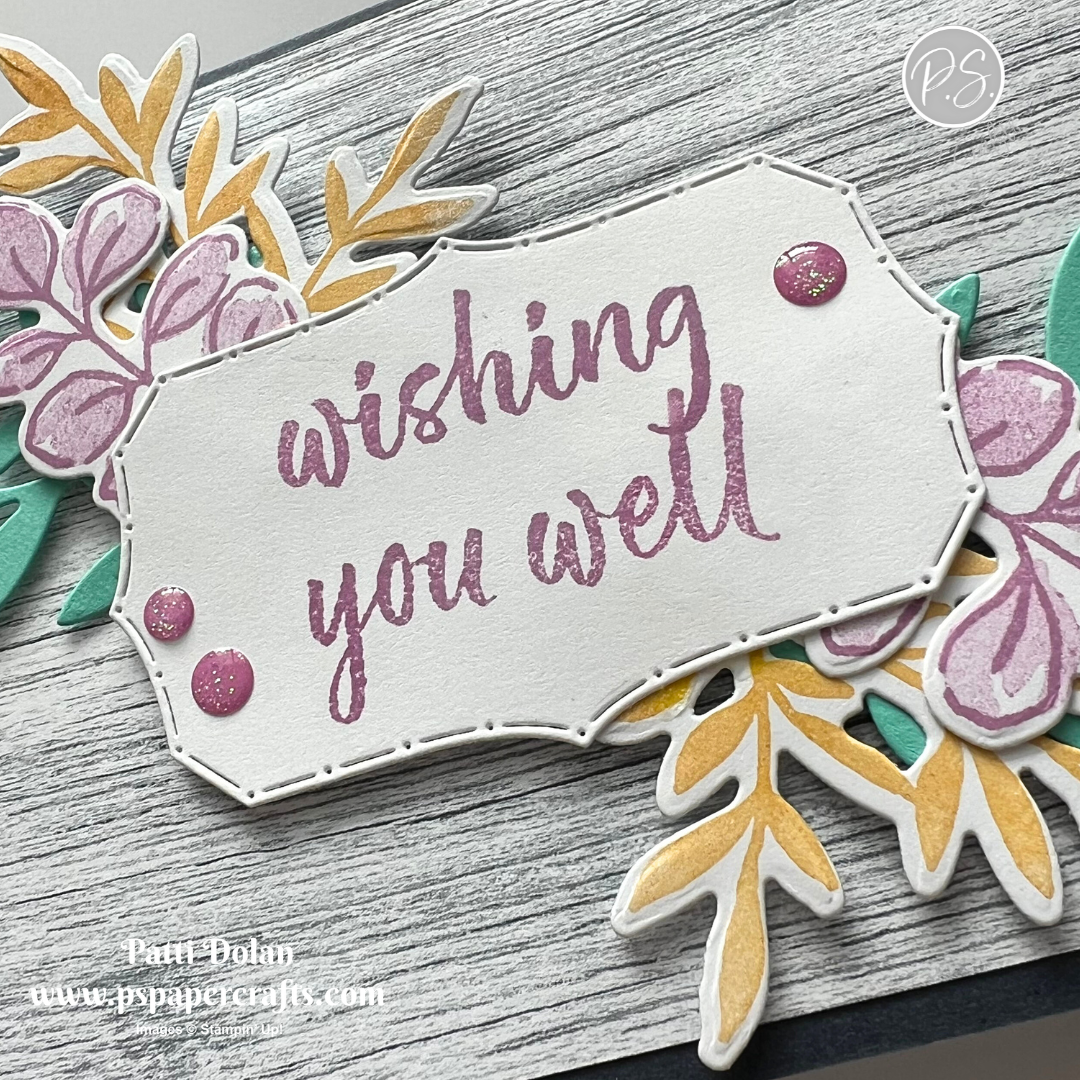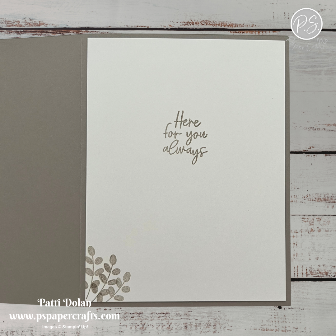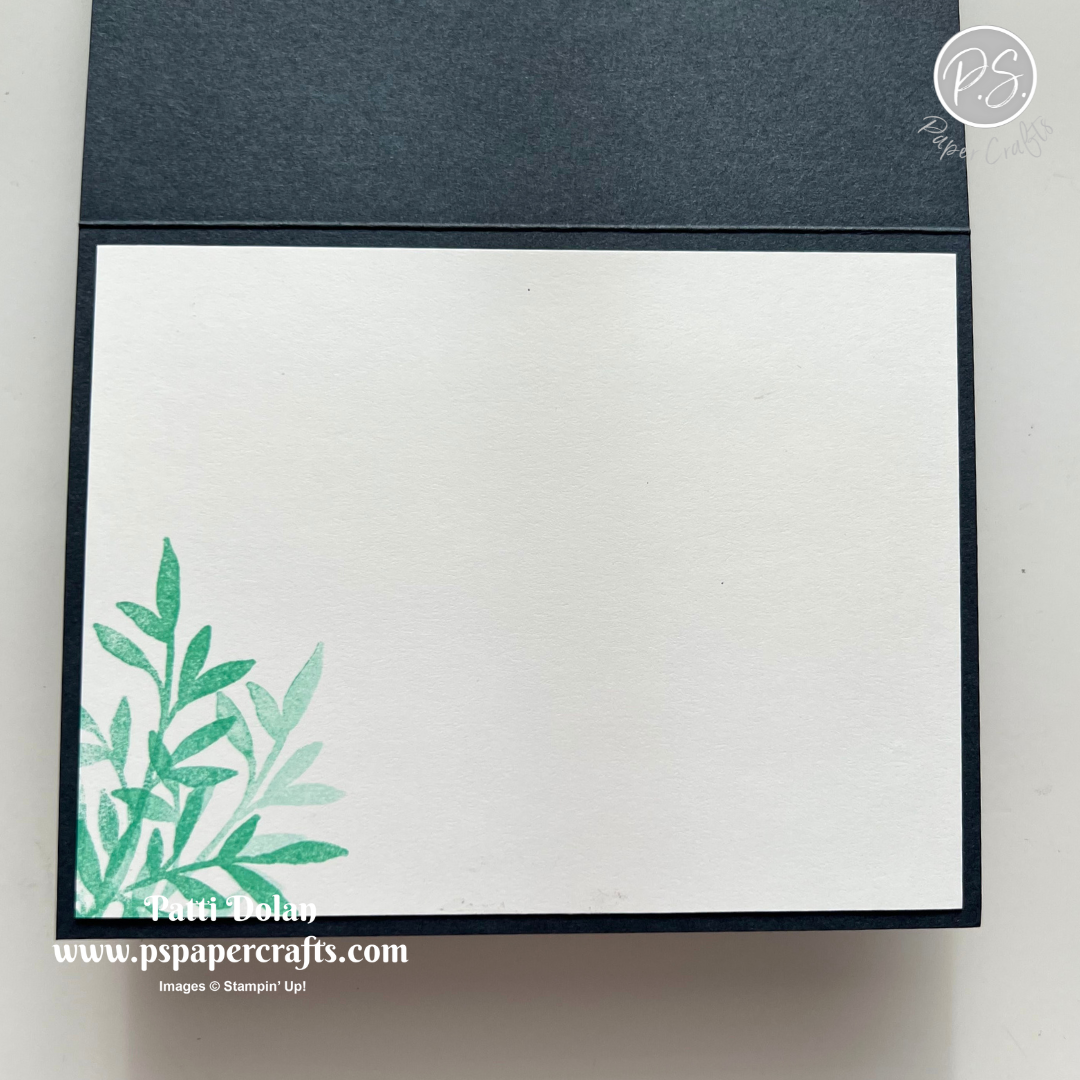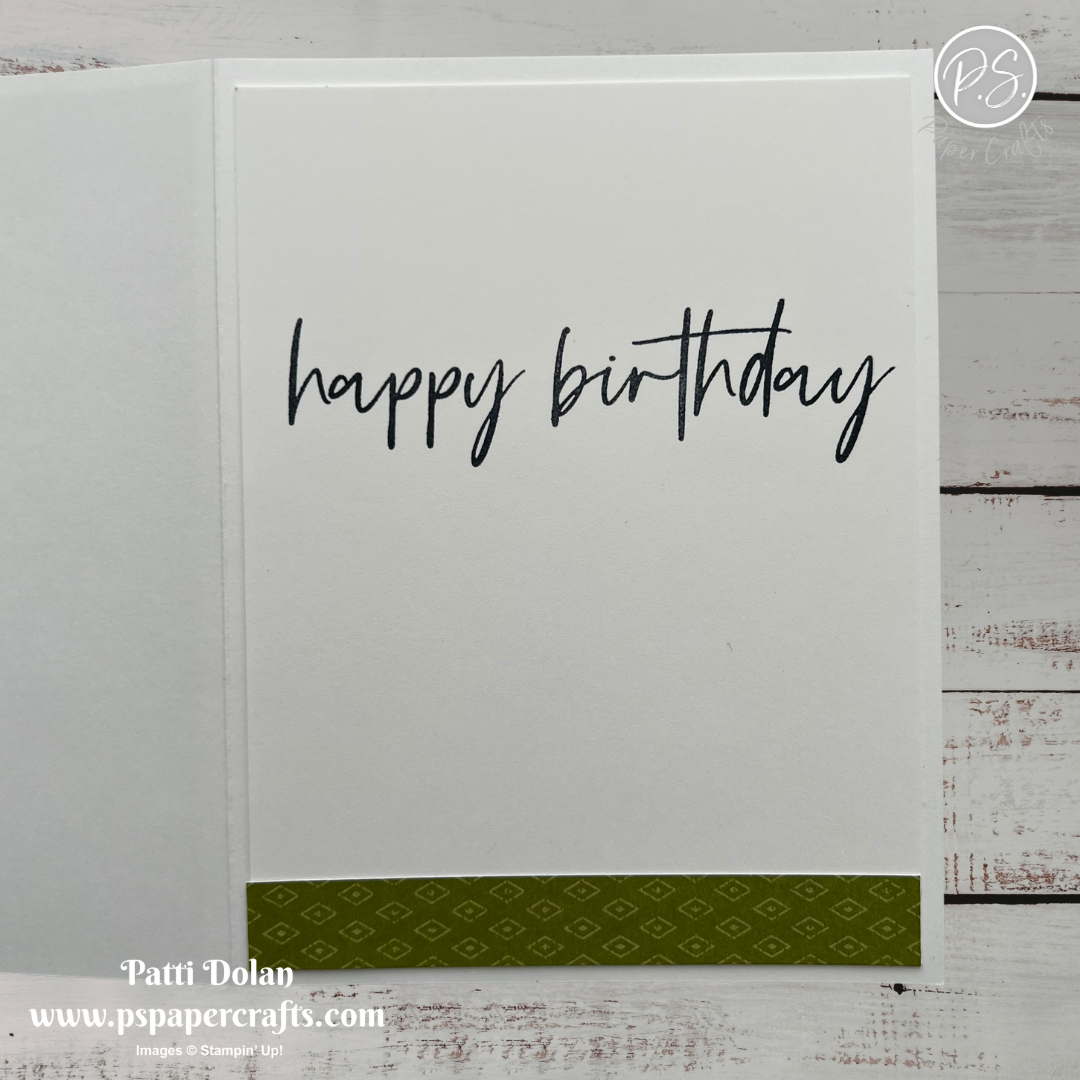 Stamp the sentiment on a 3/8” strip of Basic White in Mossy Meadow Ink and cut down. I masked the sentiment with masking tape to get just the HELLO. Adhere to the card with Dimensionals.