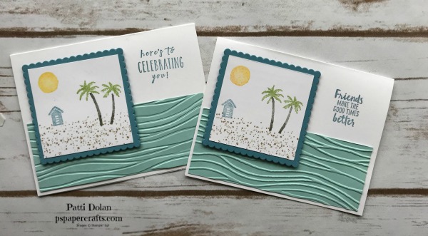 I really like how these came out, the colors make them so beachy....is that even a word :) I used the Seaside Embossing folder with a strip of Pool Party to get the waves. The scene was stamped on Whisper White Cardstock with a scalloped layer of Marina Mist behind it.