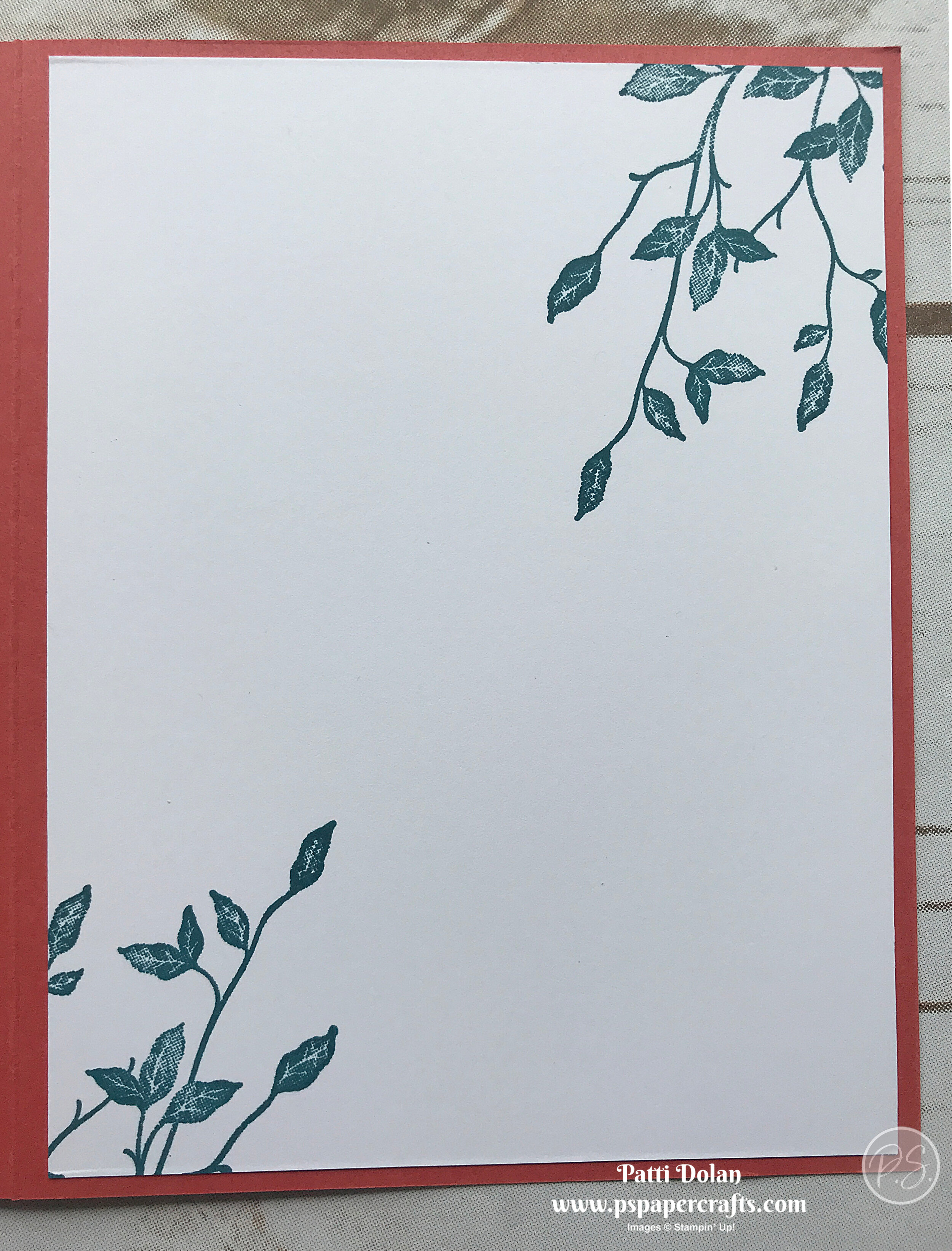 Stamp script image with Terracotta Tile Ink on top right and bottom left area, stamping off twice first (note stamping off is stamping on scrap paper to remove a layer of ink, I did this twice before stamping on the layer)