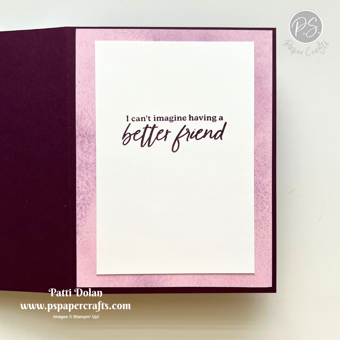 I used another 5 1/4 x 4 piece of the designer series paper for the inside layer. Cut a piece of Basic White at 4 3/4 x 3 1/4 and stamp the sentiment in Blackberry Bliss Ink. Adhere layers.