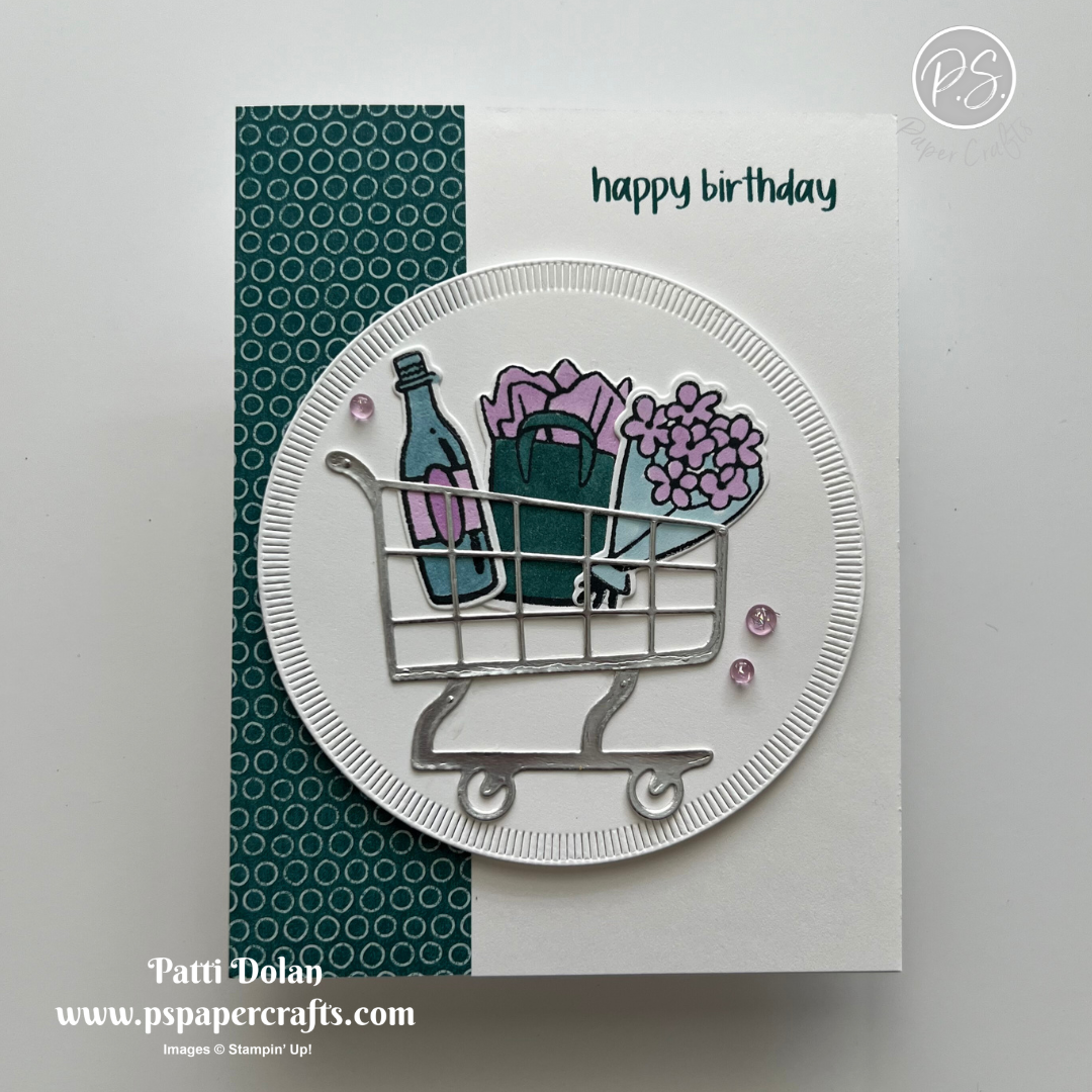 Arrange the images on the circle behind the shopping cart to determine placement. Adhere them to the circle and then adhere the circle to the card using Dimensionals. .