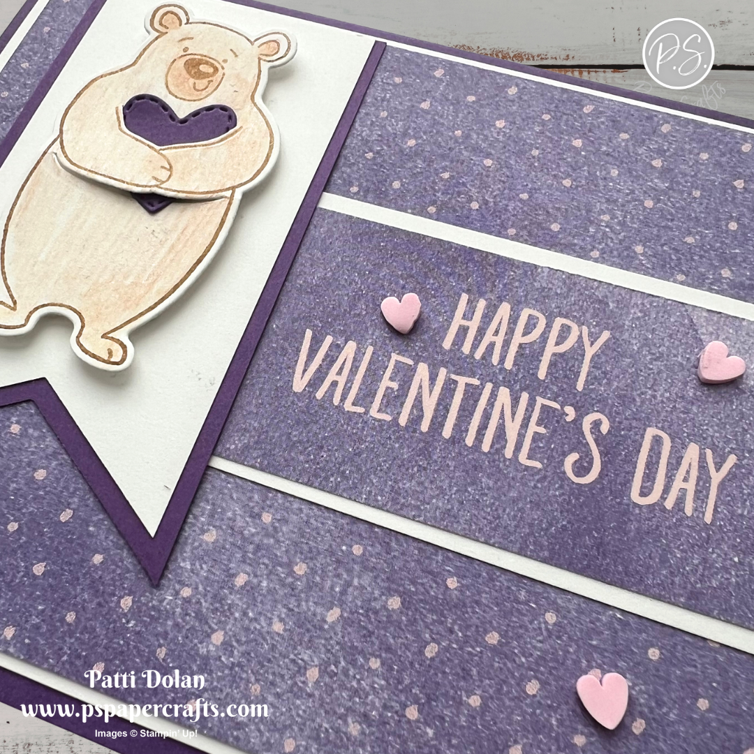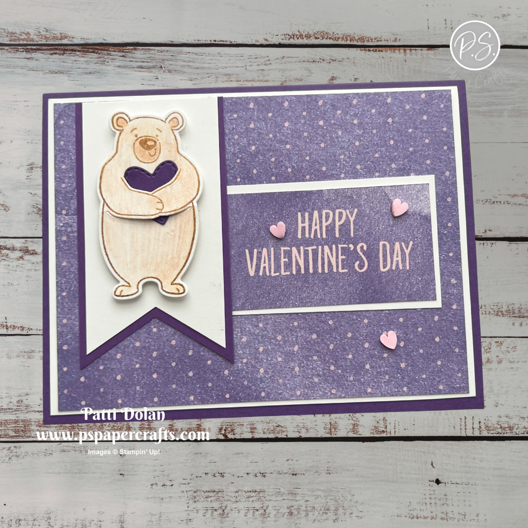 Die cut the heart from a scrap of Gorgeous Grape push it under the arms of the bear. Adhere to the banner with Dimensionals.