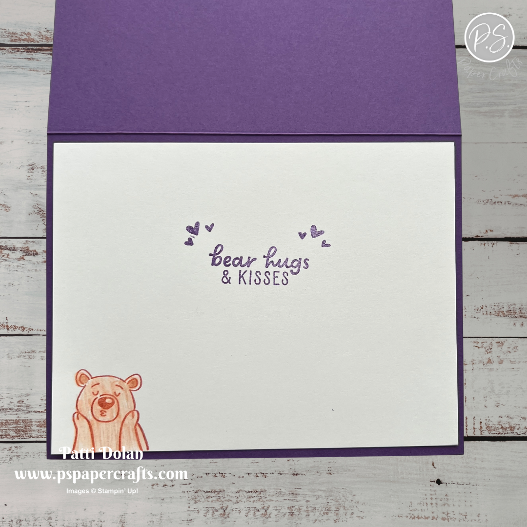On the inside layer (4 x 5-1/4), stamp sentiment in Gorgeous Grape Ink and add some Gorgeous Grape hearts. Stamp the bear in Pecan Pie Ink and color with a Calypso Coral Watercolor Pencil and then blend it with a Blender Pen.