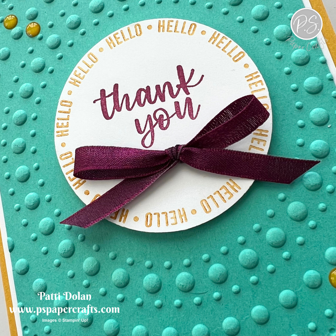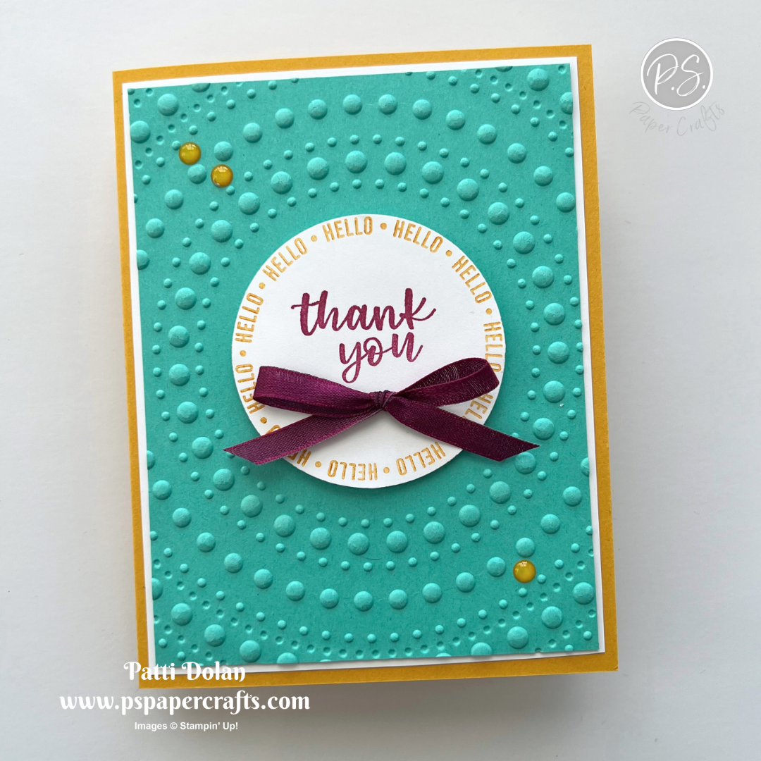 There are circles everywhere on this card! I used the A Round of Hellos Stamp Set, a Circle Punch, and the Dotted Circles 3D Embossing Folder. Are you feeling a little dizzy yet?