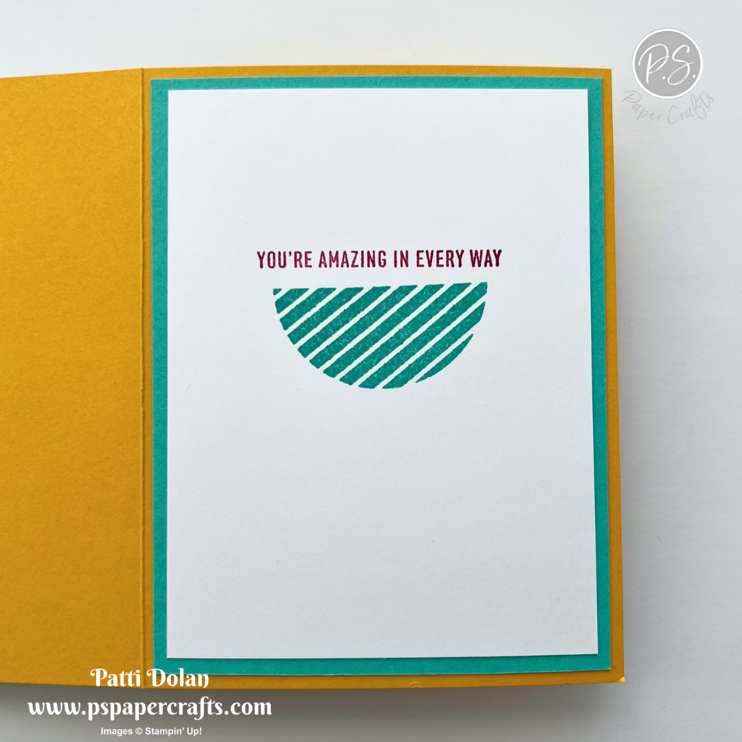 For the inside layer I cut a piece of Summer Splash Cardstock at 4 x 5-1/4. Then on a 3-3/4 x 5 piece of Basic White Cardstock, stamp the sentiment in Berry Burst Ink and the half circle in Summer Splash Ink. Adhere to the Summer Splash layer and then to the inside of the card.