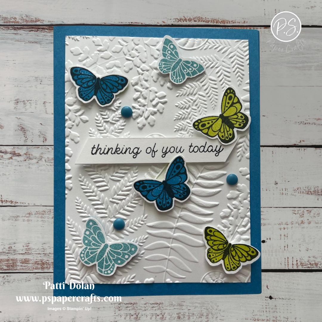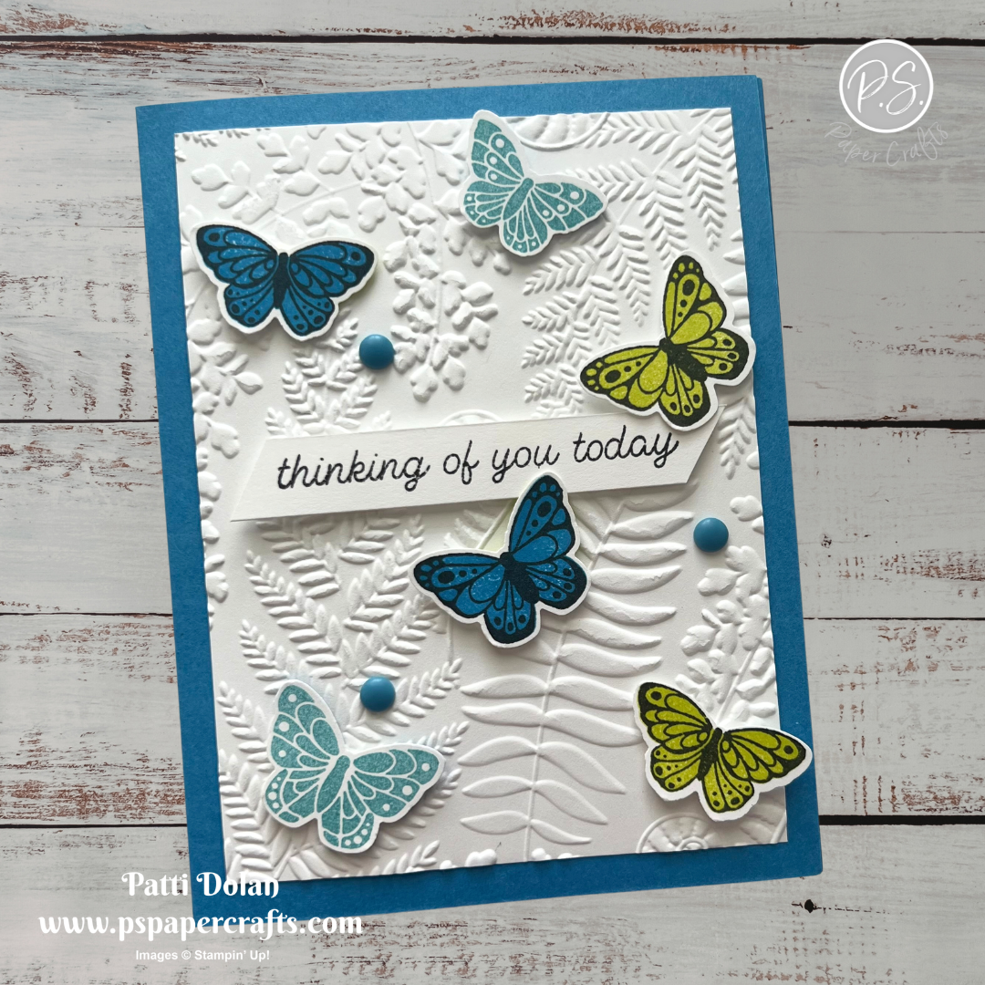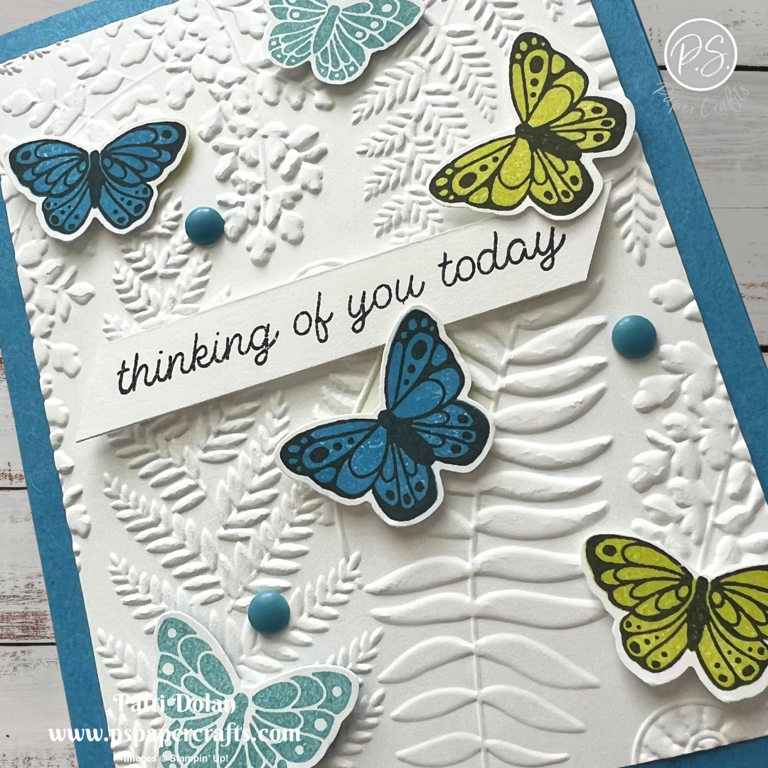 I love the butterflies fluttering around on the embossed fern layer.