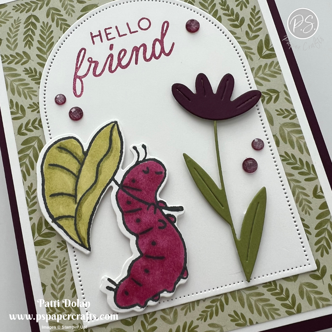 Stamp the caterpillar holding the leaf on Basic White in Black Memento Ink. Color with Stampin’ Blends. I used Berry Burst and Old Olive. Die cut with coordinating die. Adhere to the arch with Dimensionals.