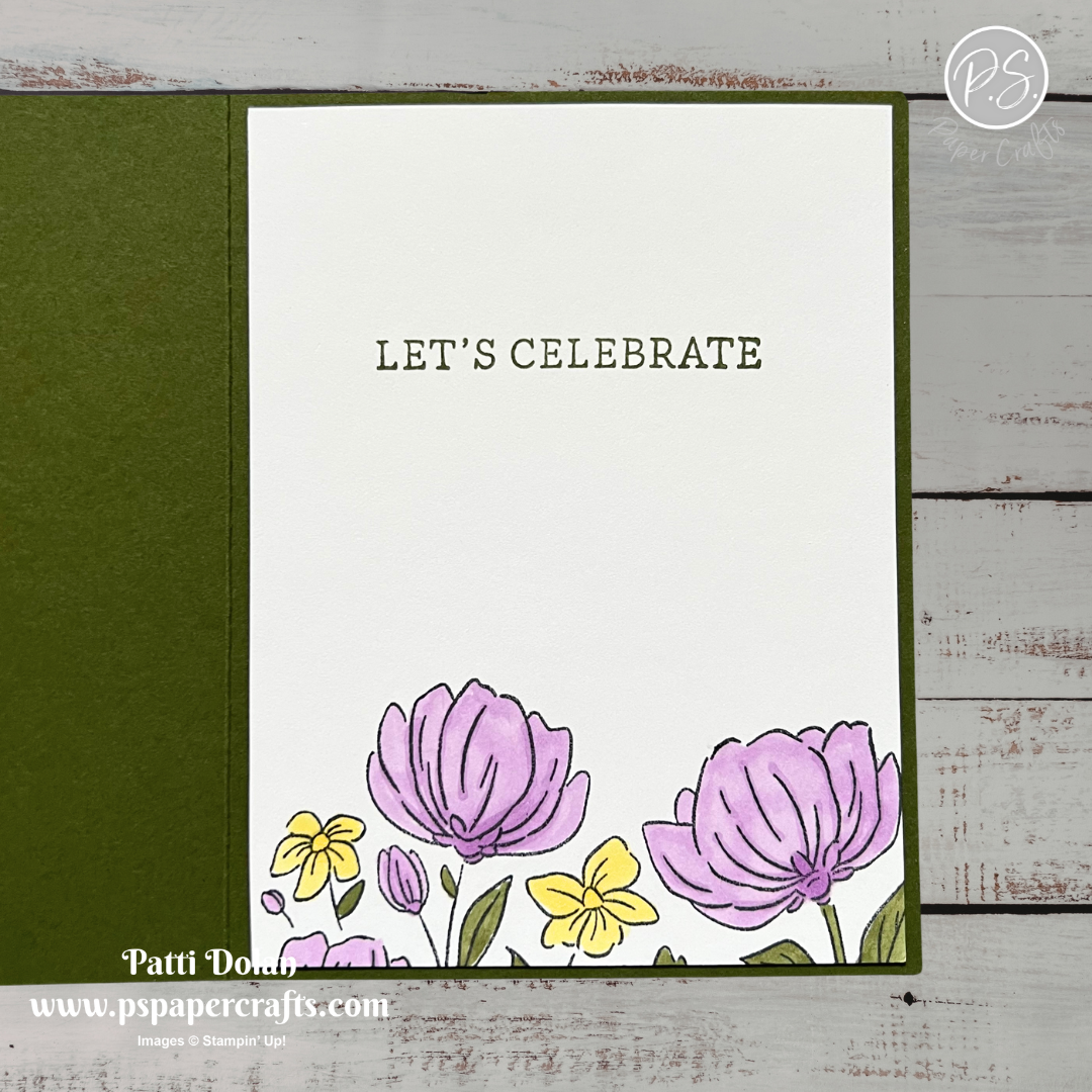 On the inside layer (4 x 5-1/4), stamp the sentiment in Mossy Meadow Ink. Stamp just the top part of the Flower Fair Stamp at the bottom of the layer and color with Stampin’ Blends Markers.