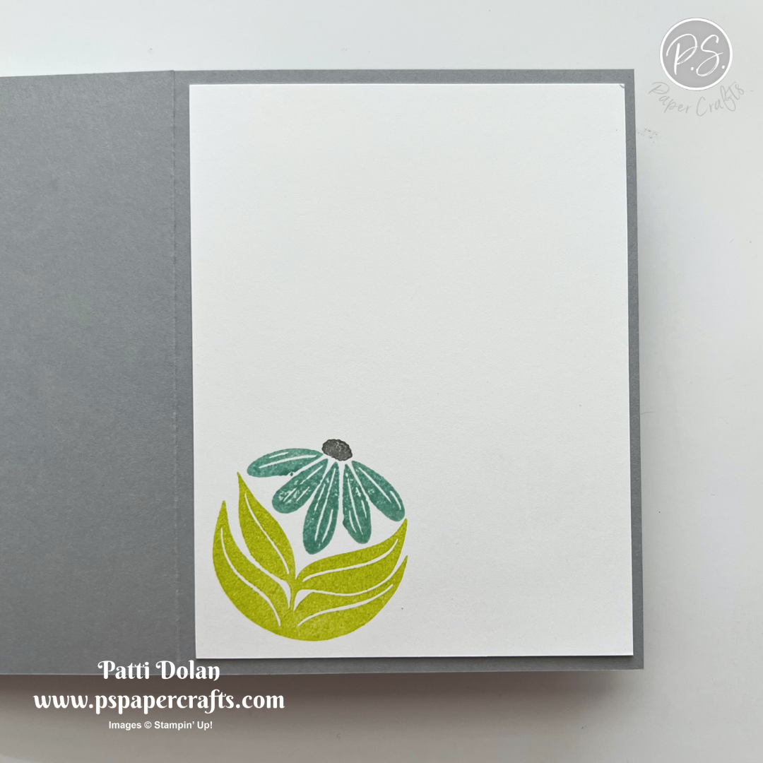 On the inside layer (4 x 5-1/4), stamp the leaves in Lemon Lime Ink, the flower in Pool Party Ink and the flower center in Smoky Slate Ink.