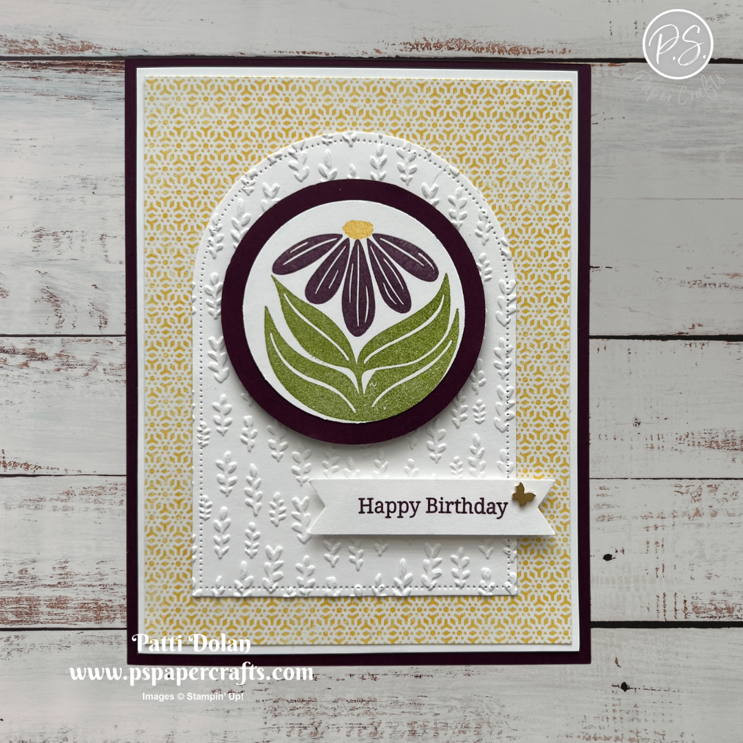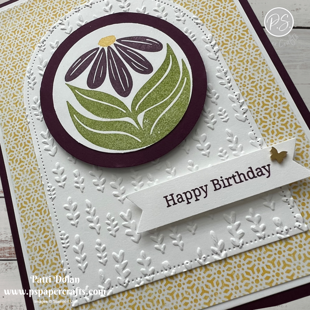 On the circle stamp the leaves in Granny Apple Green Ink, the flower in Blackberry Bliss Ink and the flower center in Daffodil Delight Ink.