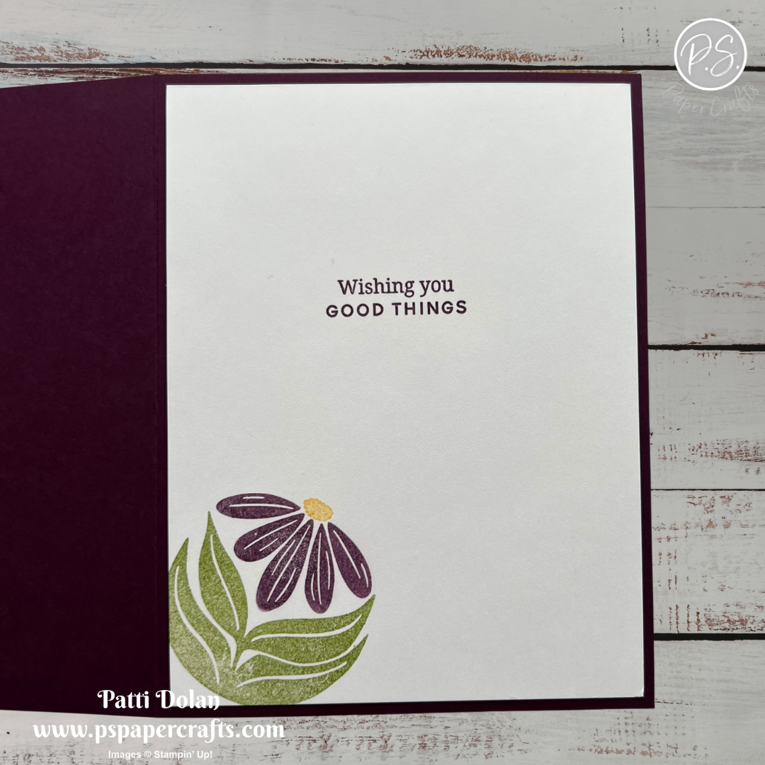 On the inside layer (4 x 5-1/4), stamp the sentiment in Blackberry Bliss Ink using the Banner Sayings Stamp Set. Stamp the flower at the bottom corner.