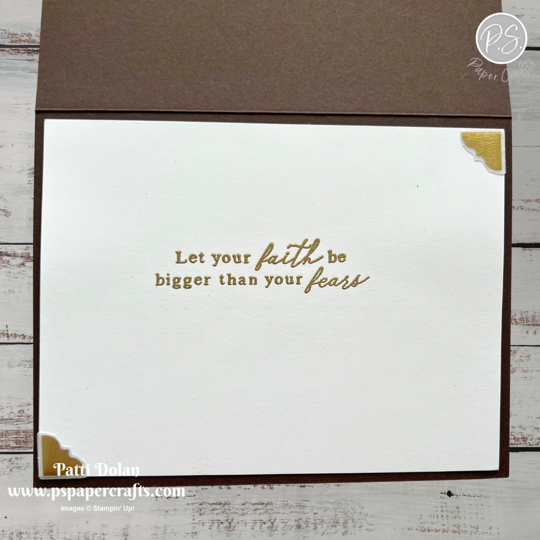 On the inside layer (4 x 5-1/4), stamp the sentiment in Versamark Ink and emboss it with gold embossing powder. Adhere 2 of the gold corner pieces.