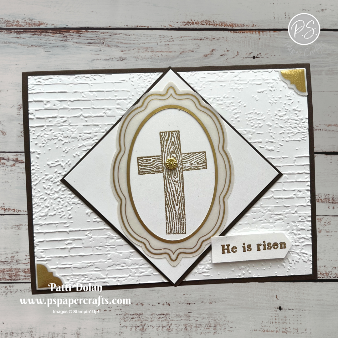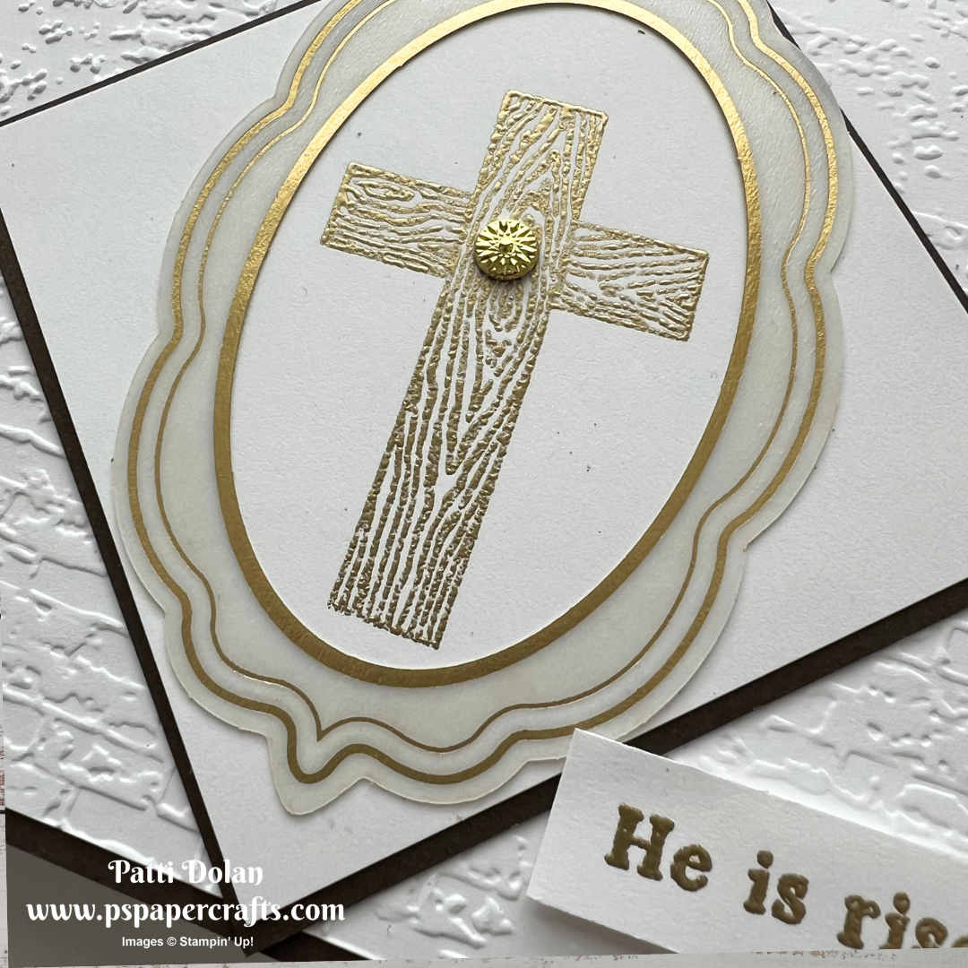 Basic White - 2-7/8 x 2-7/8, stamp the cross from the Faith Collection Stamp Set in Versamark Ink and emboss it with gold embossing powder.