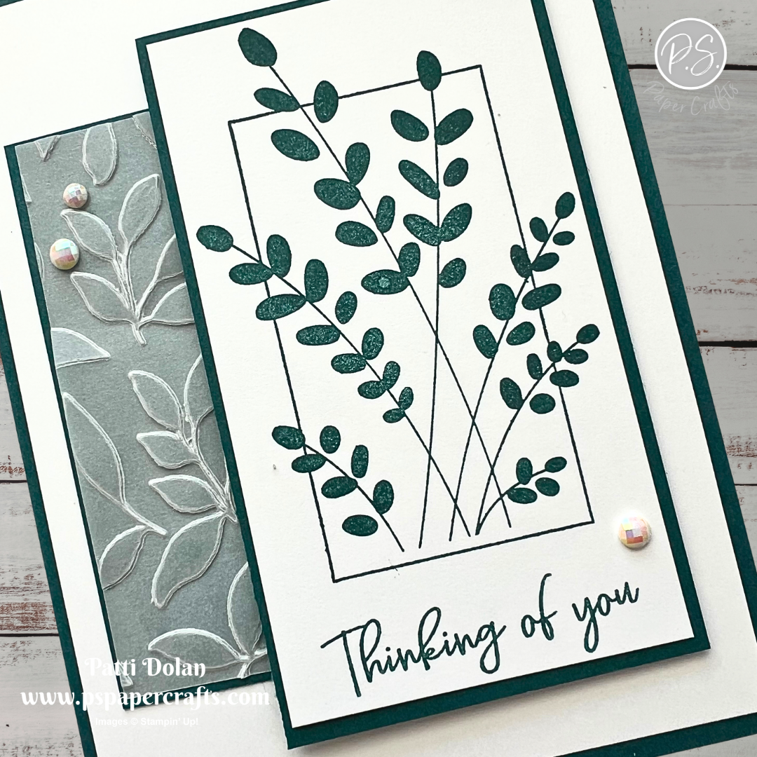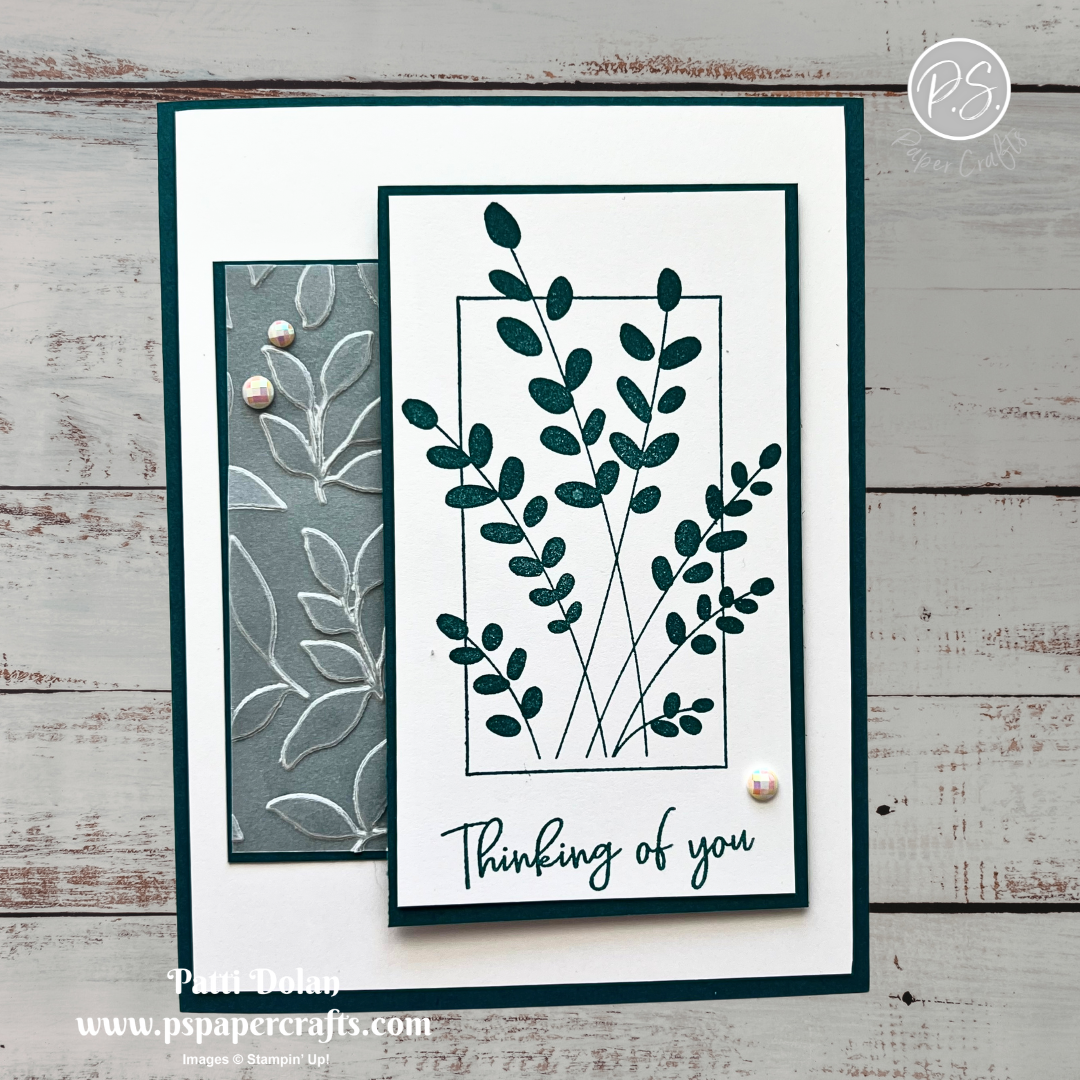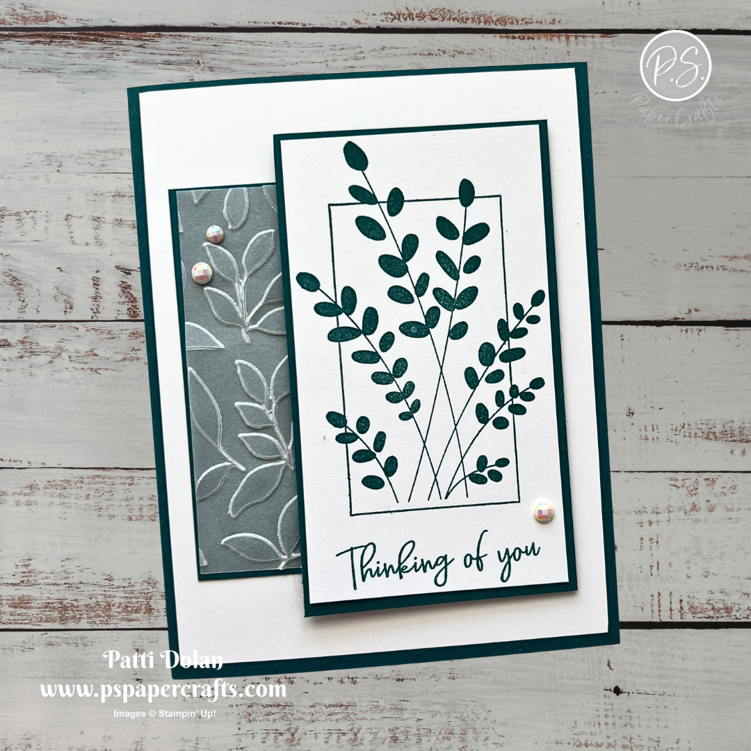 I love the delicate look of the leafy image from the Friendly Foliage Stamp Set. I paired it with an embossed piece of vellum, and the result is soft and pretty!