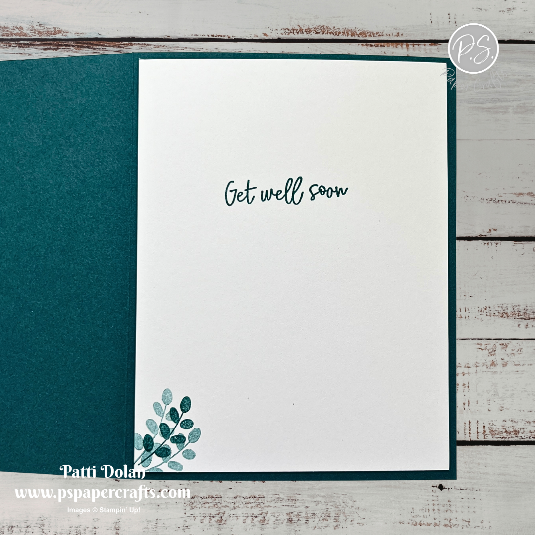 On the inside layer (4 x 5-1/4), stamp the sentiment in Pretty Peacock ink. Stamp the small branch, then stamp a second time without re-inking. Ink up the stamp and stamp on scrap, then stamp the third branch on the layer.