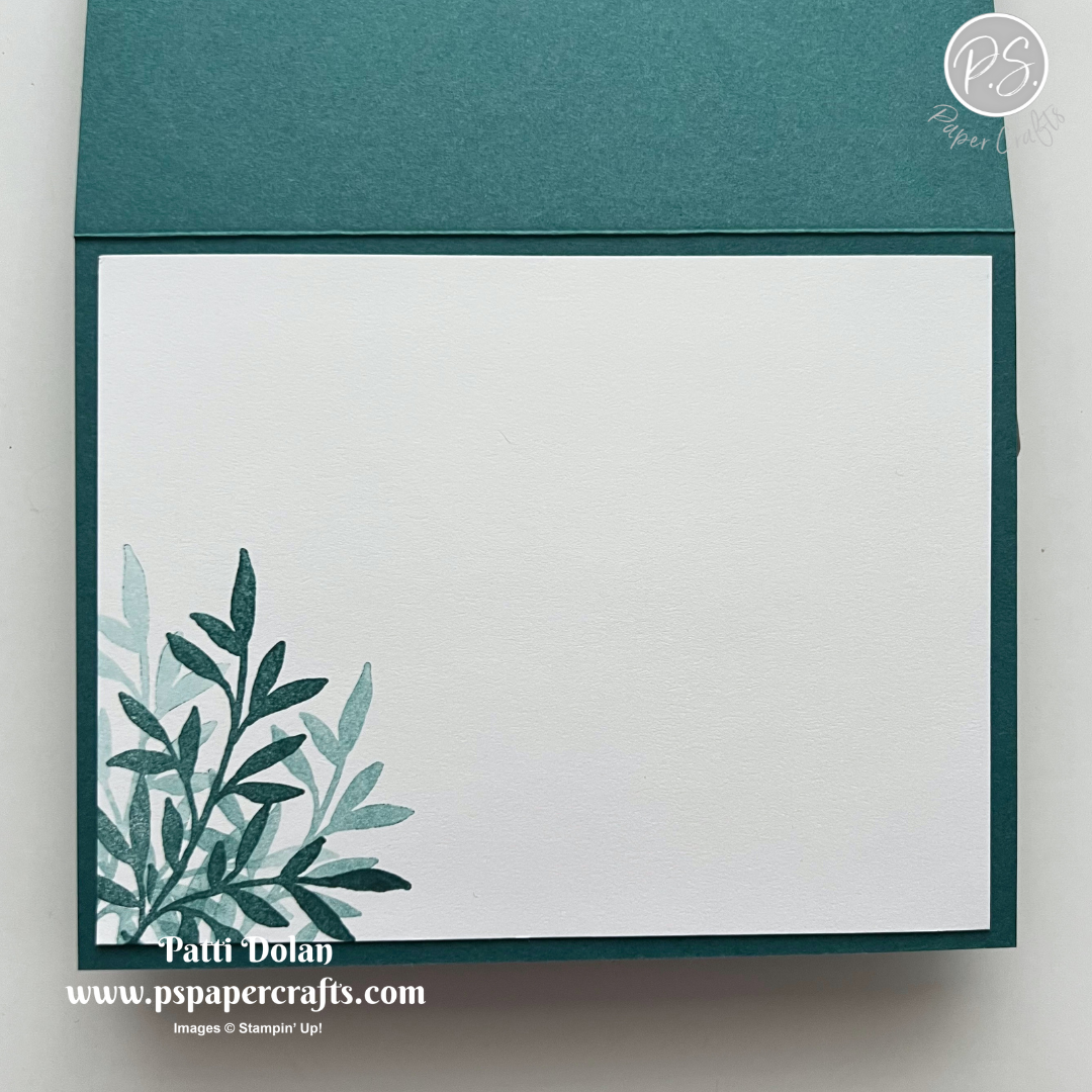 On the inside layer (4 x 5-1/4), stamp large branch in Pretty Peacock, stamp a second and third time without re-inking.