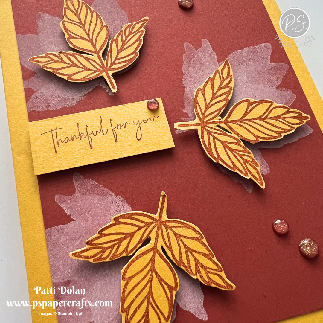 Stamp 3 leaves using the detailed side on Crushed Curry Cardstock in Cajun Craze Ink. Fussy cut the leaves and adhere to the layer over the white stamped images, offsetting a little bit.
