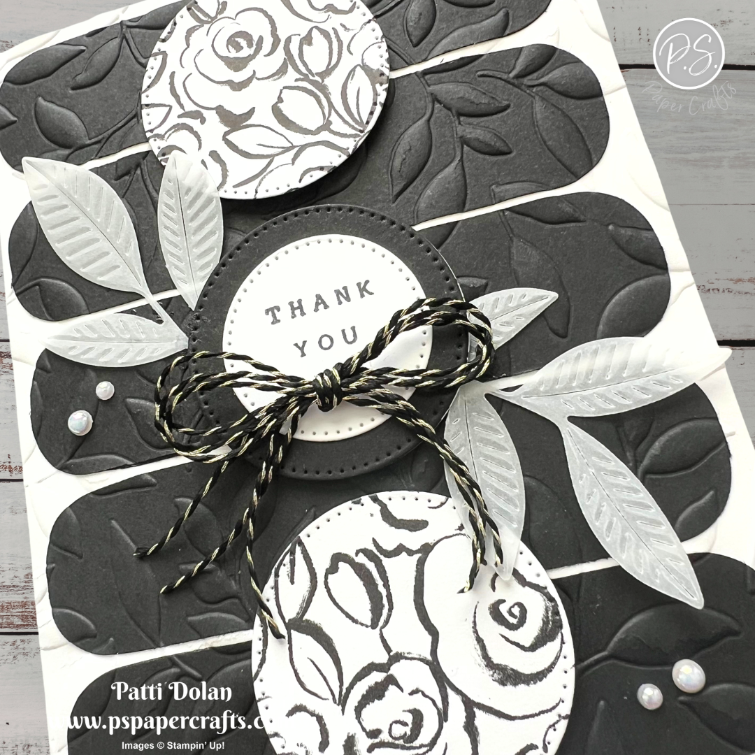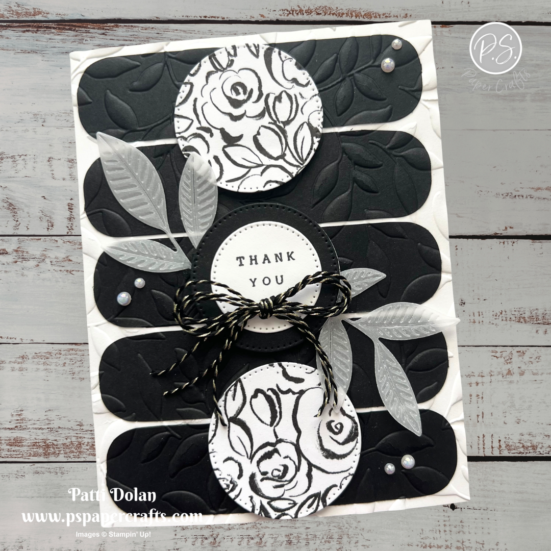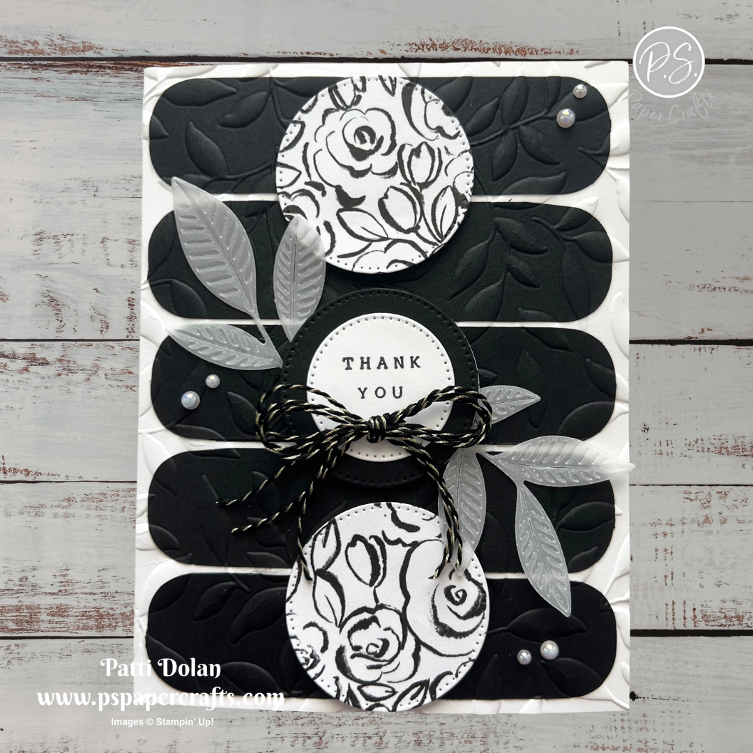 This week’s Sketch Challenge from Splitcoaststampers was a real challenge for me. I went with a Black & White card and at first I didn’t really like how it looked. Then I decided to emboss the front and added some vellum leaves and think it turned out good in the end.