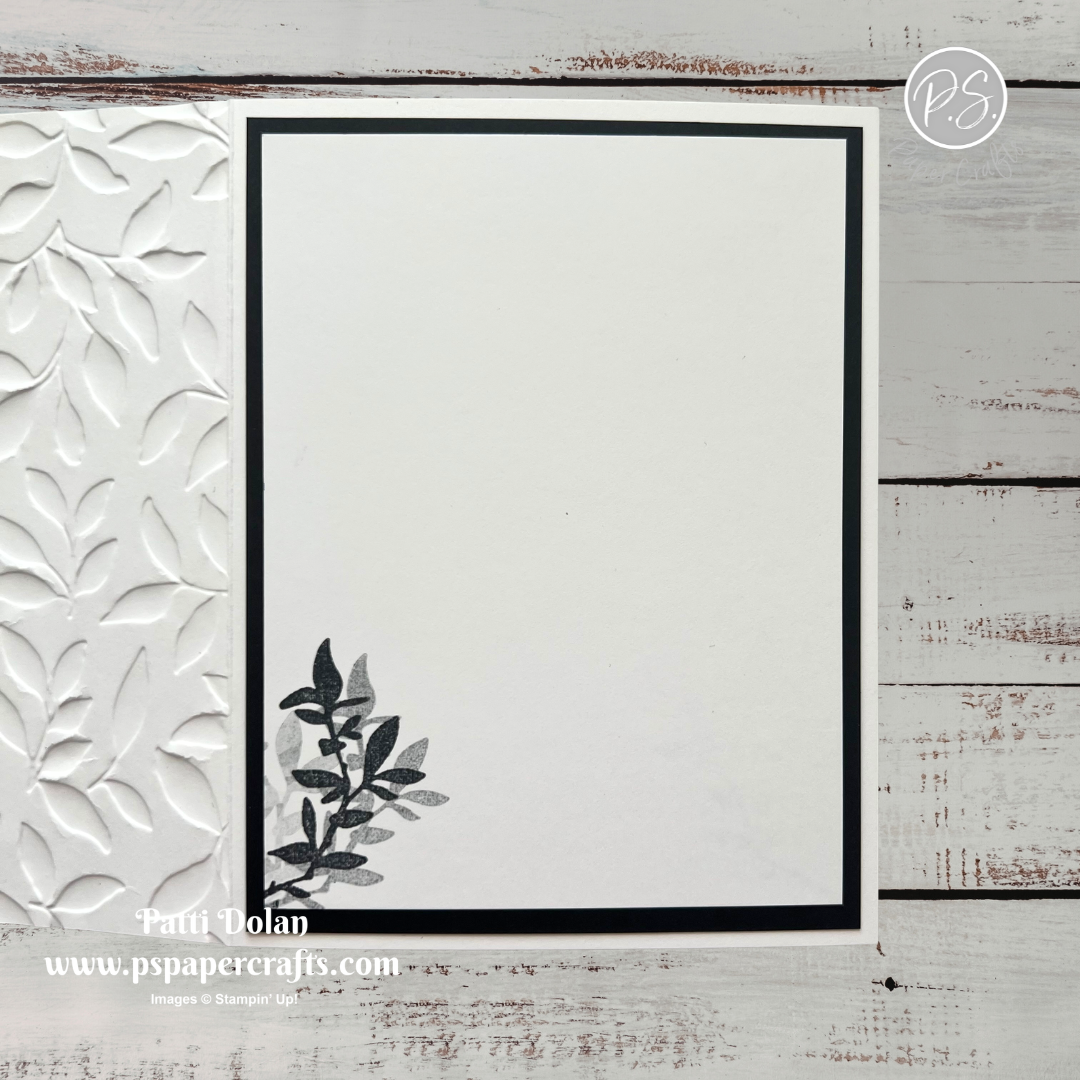 Adhere a 4 x 5-1/4 Basic Black layer to the inside. Cut a Basic White layer at 3-3/4 x 5 and stamp the branch image repeating without re-inking. Adhere to the black layer.