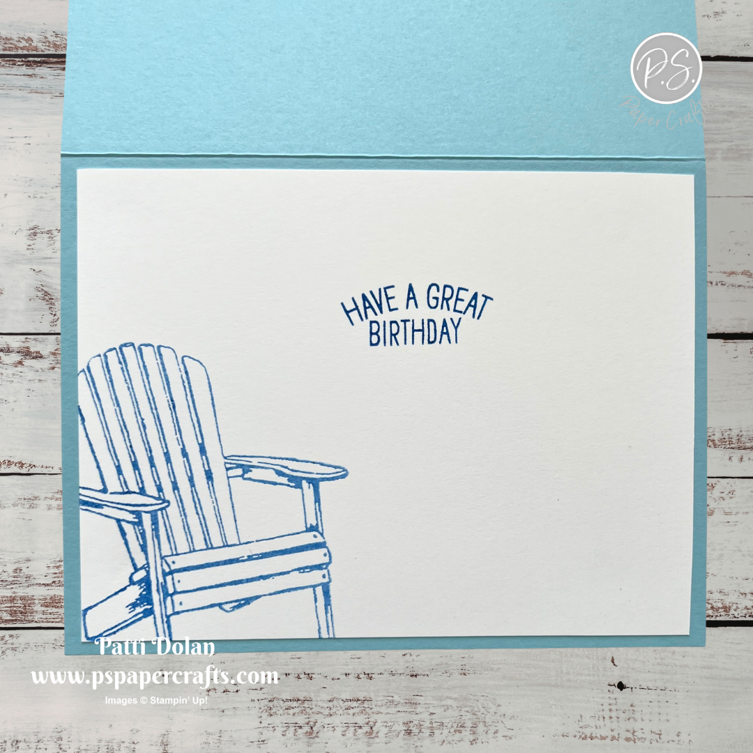On the inside layer (4 x 5-1/4), stamp the sentiment in Blueberry Bushel ink. Stamp the chair in Blueberry ink but stamp off first to get a lighter shade.