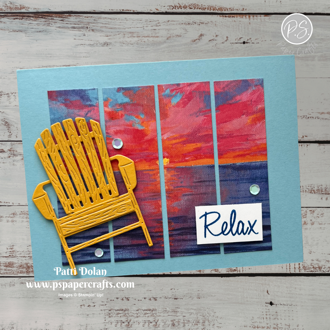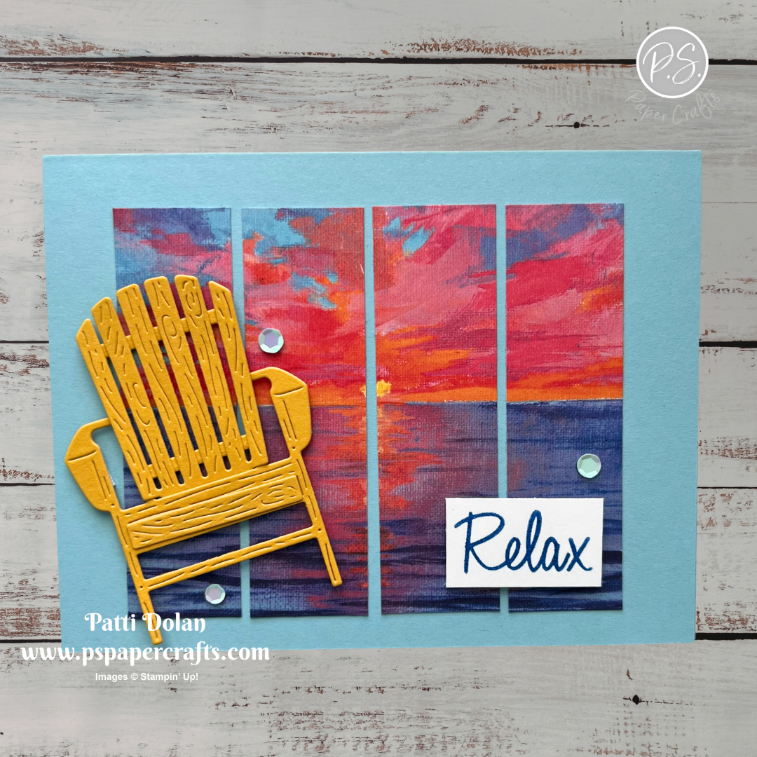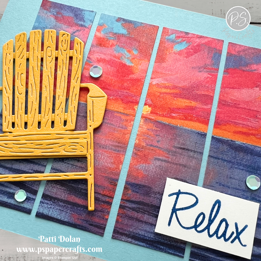 Die cut the 2 parts of the Adirondack chair from Crushed Curry Cardstock using the Relaxing Waterside Die. Adhere the pieces together and then adhere the chair to the card with Dimensionals.