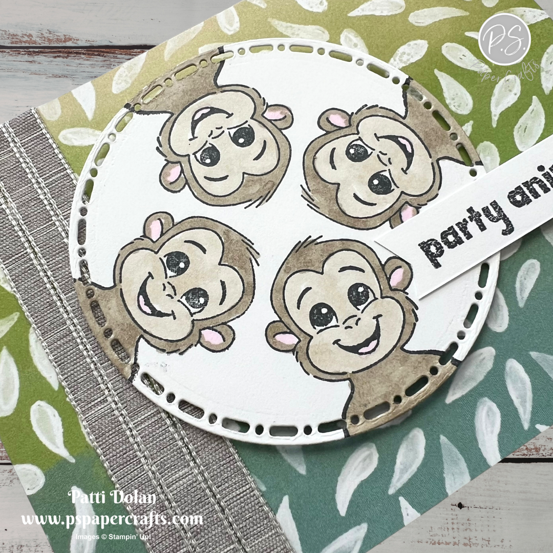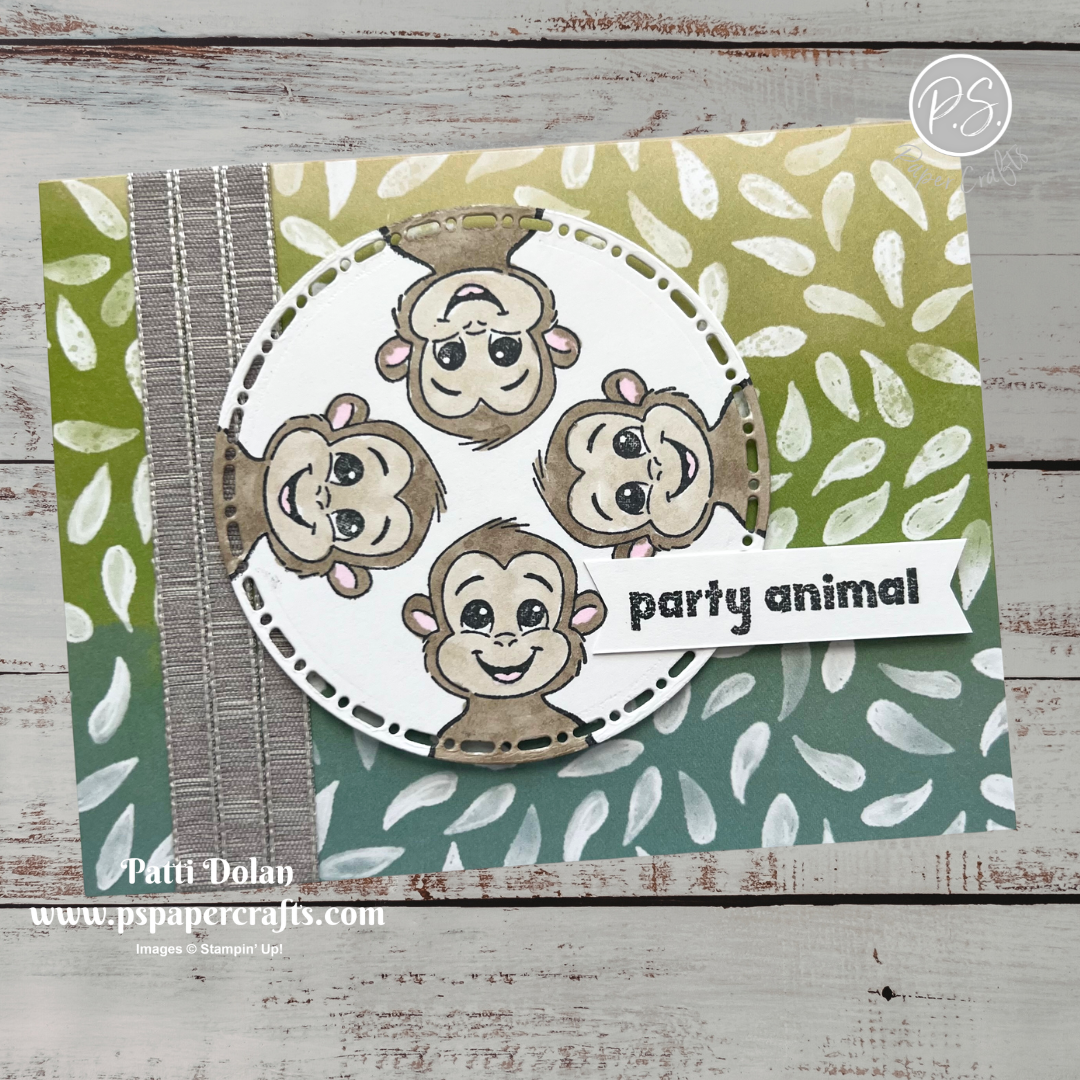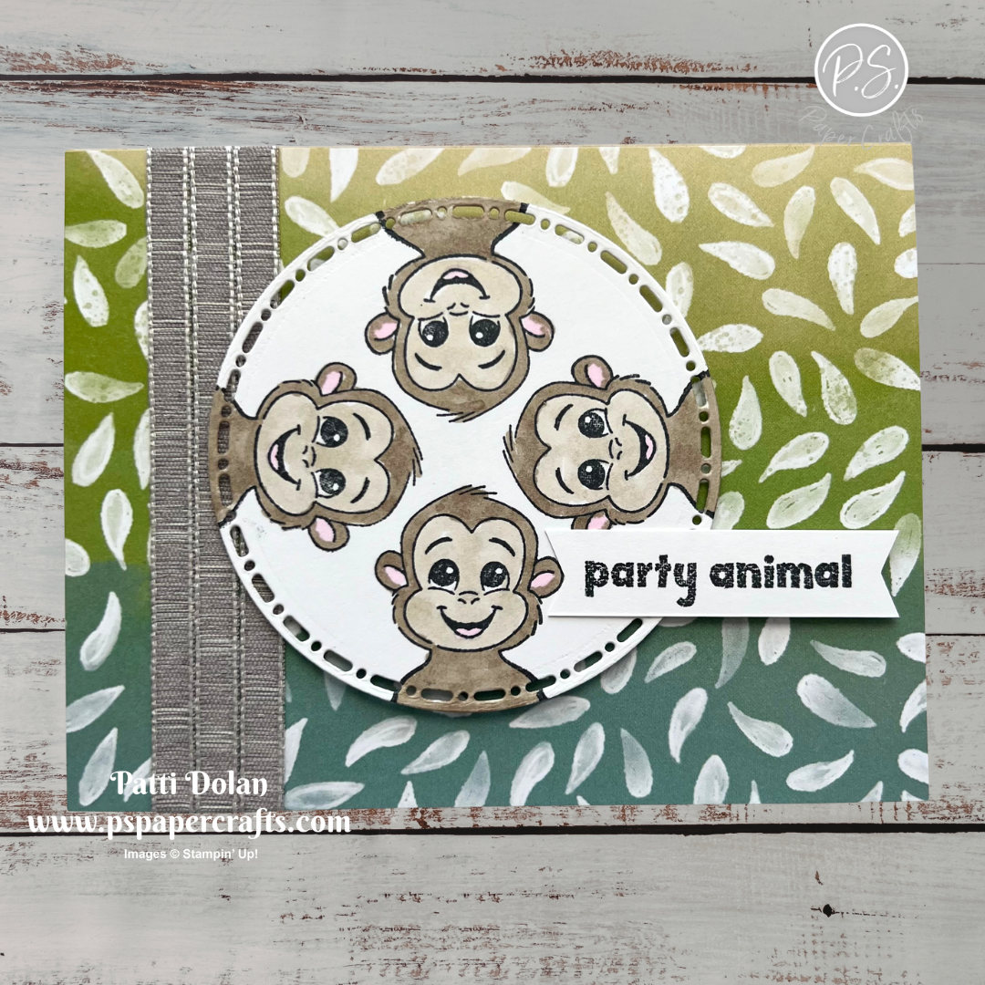 I love these cute little monkeys from the Silly Safari Stamp Set. I stamped them on the circle to have them “monkeying around”. The ribbon I wrapped around the Painted Illusions Designer Series Paper is supposed to be bamboo to go along with the scene.