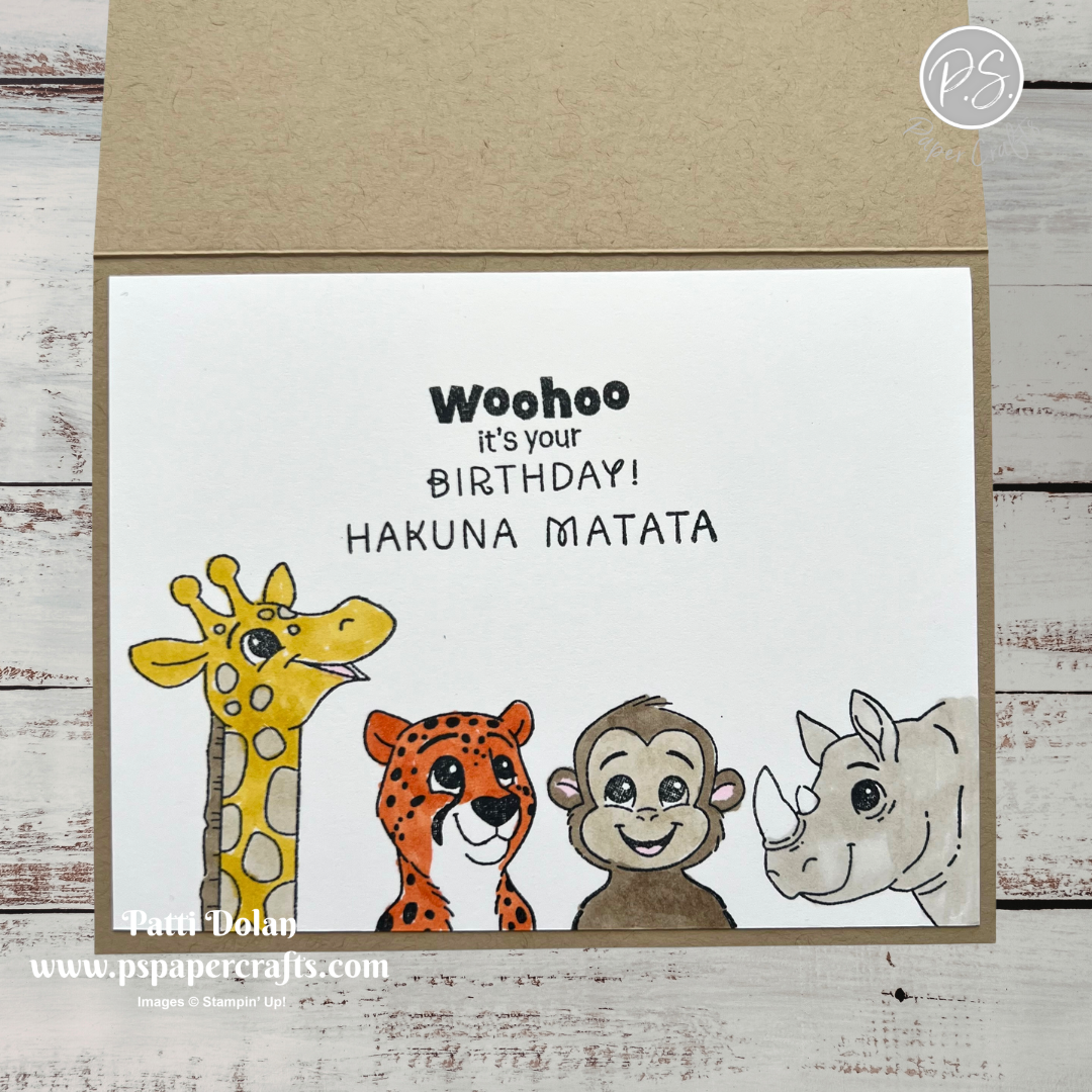 On the inside layer (4 x 5-1/4), stamp sentiment in Black Memento ink. Stamp the animals in Black Memento ink across the bottom and color with Stampin’ Blends Markers. Use Light Darling Duckling and Crumb Cake on the giraffe, Light Timid Tiger on the cheetah, Crumb Cake on the monkey and light Smokey Slate on the rhino.