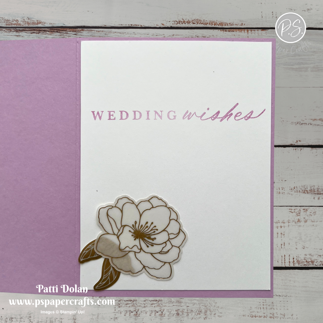 On the inside layer (4 x 5-1/4), stamp sentiment in Fresh Freesia Ink. Adhere a flower and leaves from the Ephemera Pack. I cut off part of the leaves….I should have cut off a little more so they wouldn’t show behind the flower.