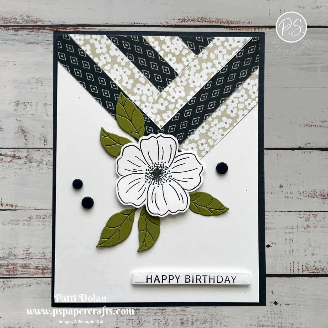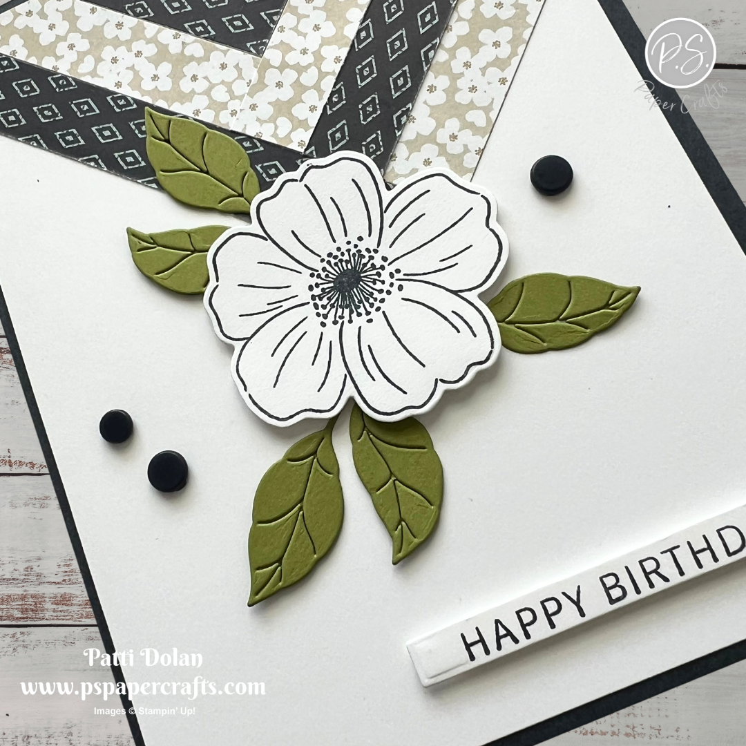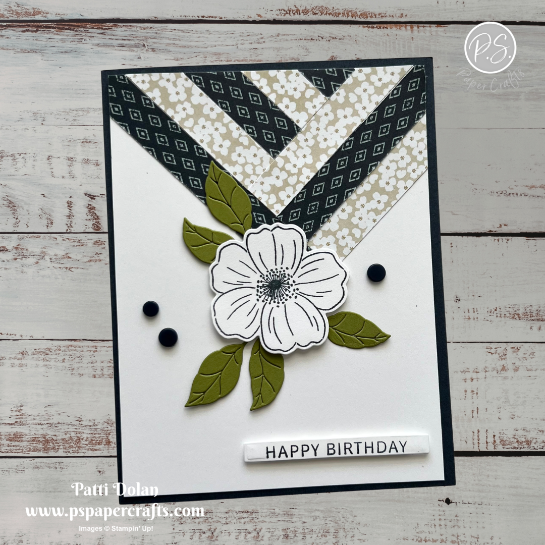 Cut 1/2” strips from the Lovely Blossoms Designer Series Paper and adhere in a pattern at the top of the card.