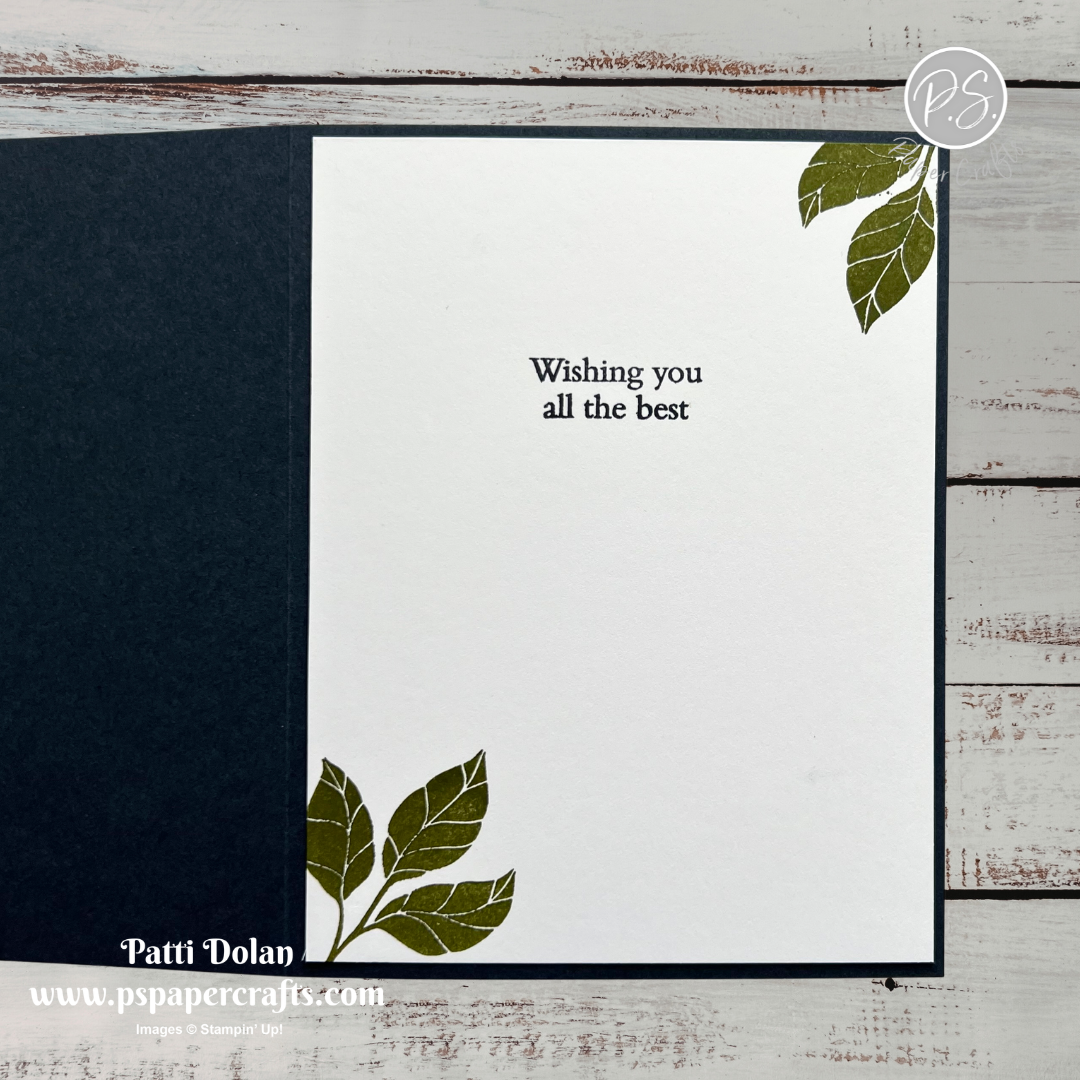 On the inside layer (4 x 5-1/4), stamp the sentiment Secret Sea ink and the leaves in Old Olive ink. The inside sentiment is from the Friendly Foliage Stamp Set.
