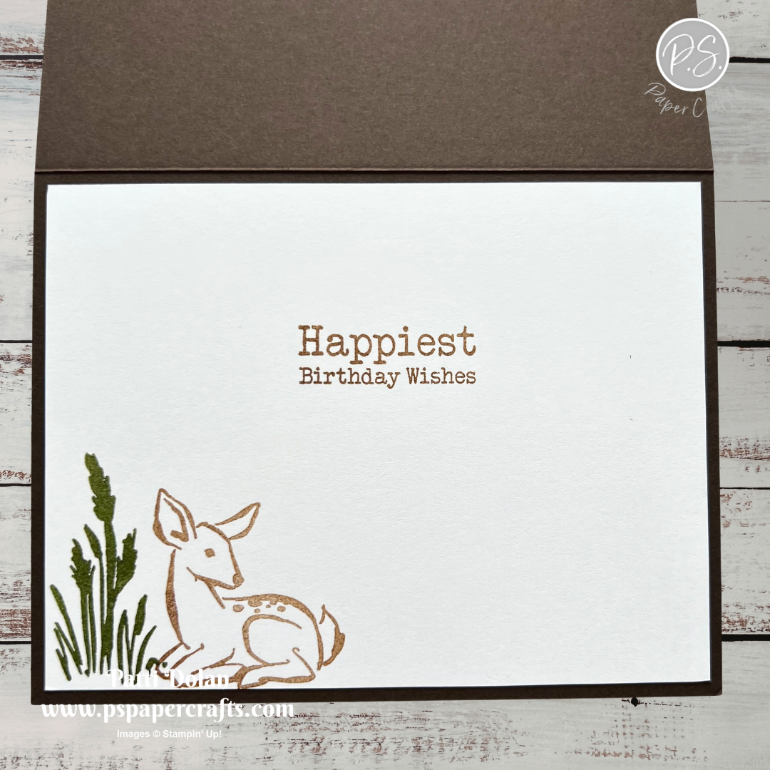 On the inside layer (4 x 5-1/4), stamp the sentiment Pecan Pie ink. Stamp the grass in Old Olive ink and the deer in Pecan Pie ink.
