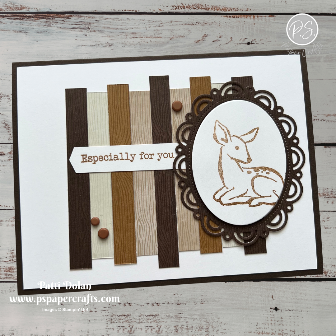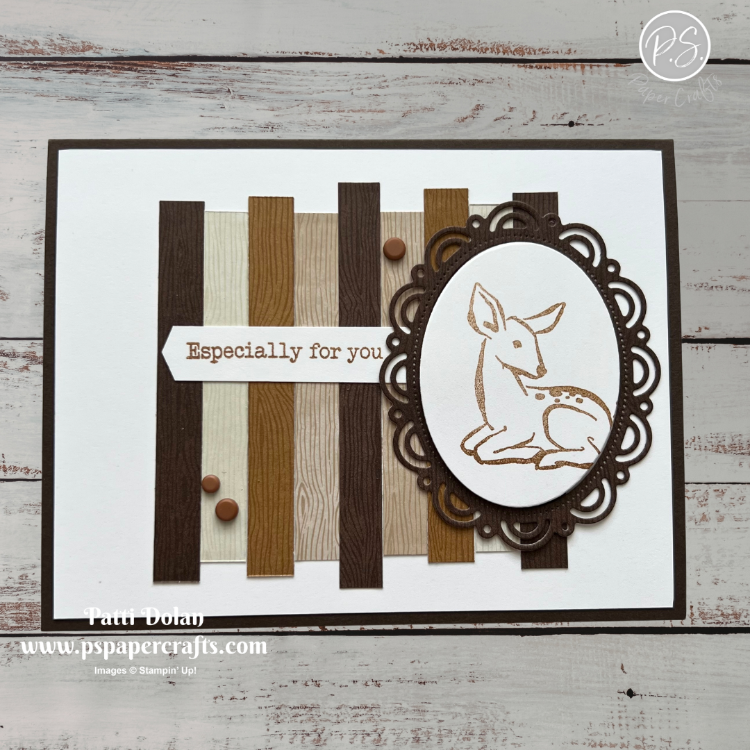 I love this sweet deer framed in the scalloped shape against the woodgrain paper strips—it gives the card such a warm, natural feel.