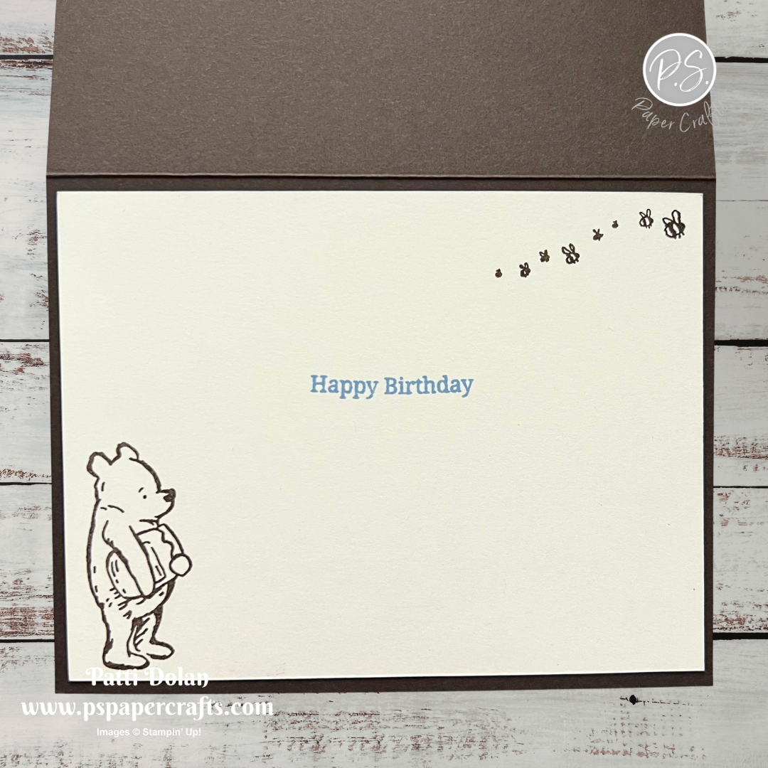 For the inside layer use a 4 x 5-1/4 layer of Very Vanilla Cardstock. Stamp the sentiment in Hydrangea Hue ink and stamp Winnie the Pooh and the bees in Early Espresso ink.
