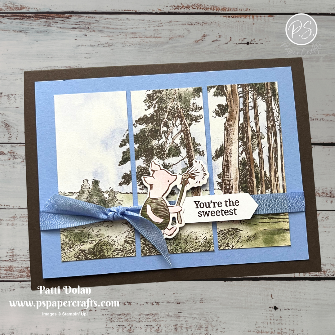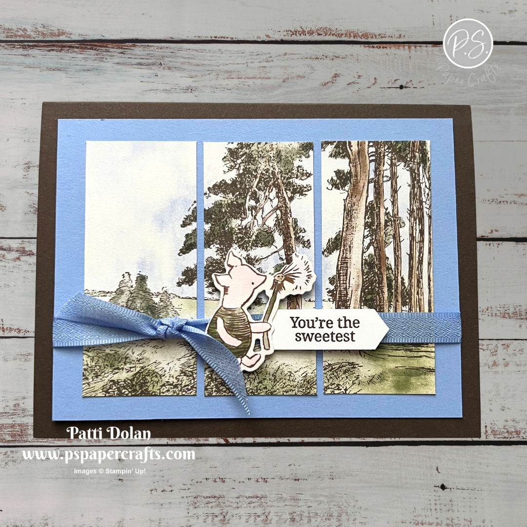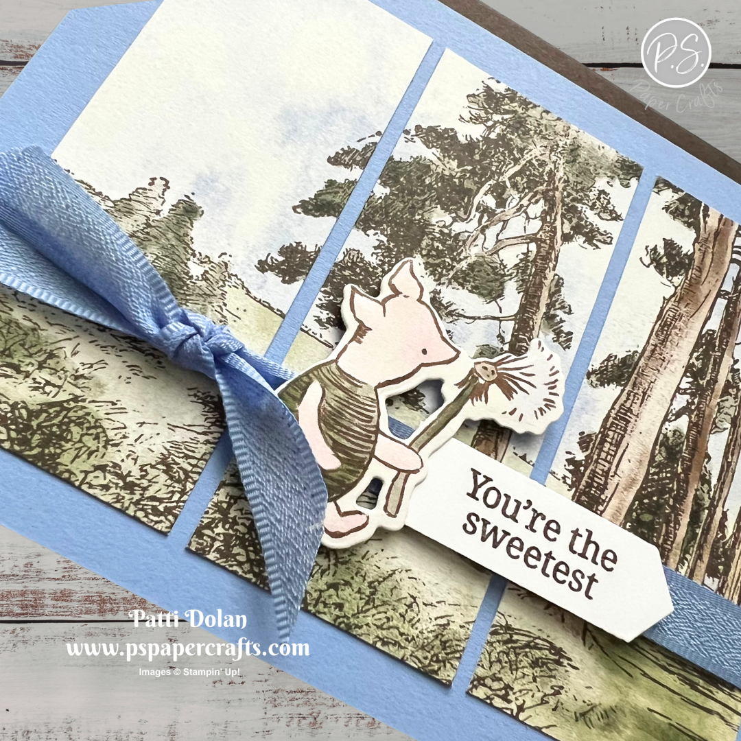Have you checked out the new Winnie the Pooh products yet? I’m loving the classic, original artwork—such a fun throwback! For this card, I used the Silly Old Bear Designer Series Paper to create the background scene and even die-cut Piglet right from the paper. The sentiment comes from the Banner Sayings Bundle.