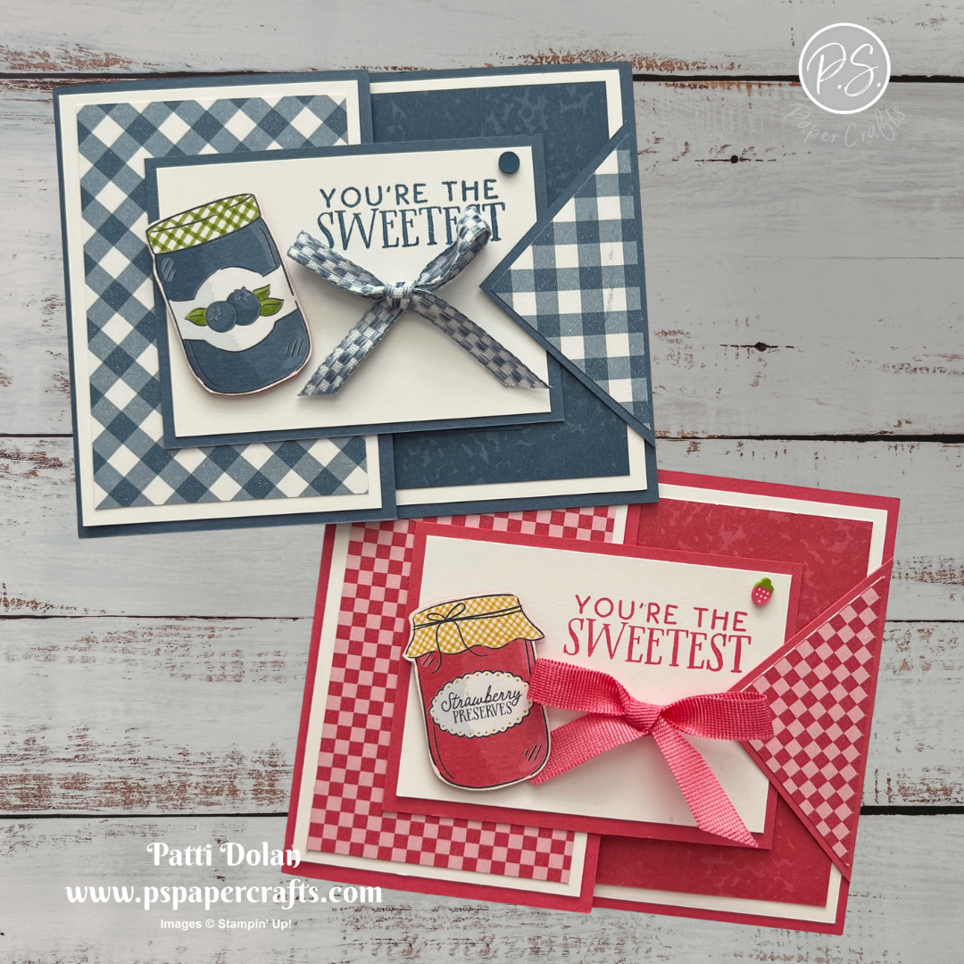 Both cards were made using products from the new Homemade Sweetness Suite Collection - the Homemade Sweetness Designer Series Paper, Filled With Sweetness Bundle, Misty Moonlight Checkered Trim and Strawberries & Dots. These products will be available starting March 3, 2026 when the new Online Exclusives launch.