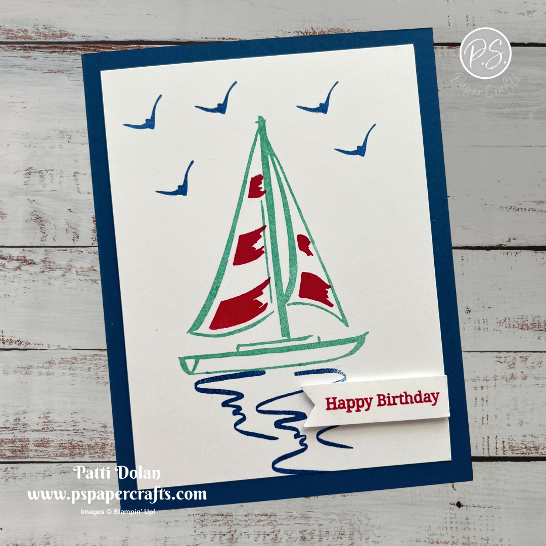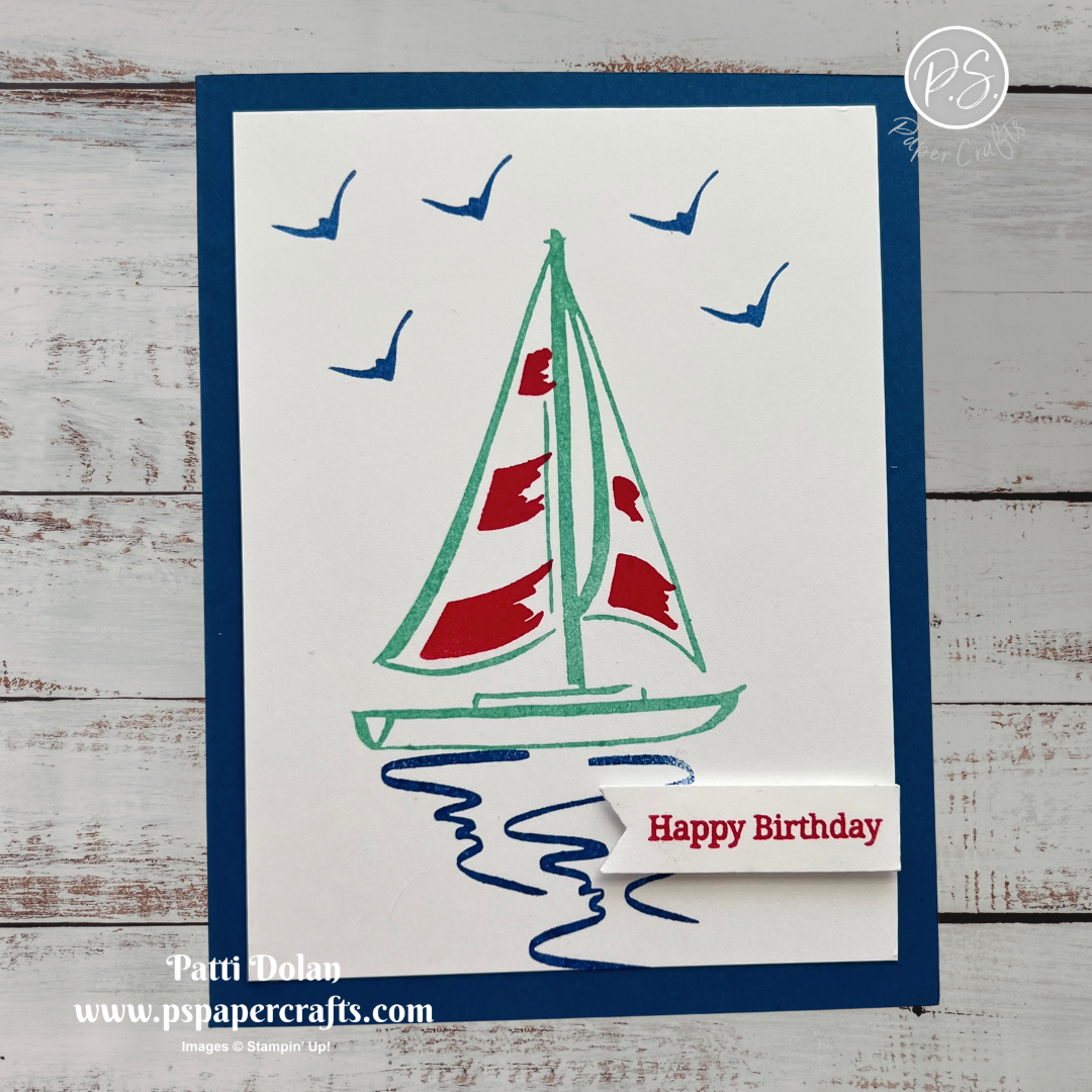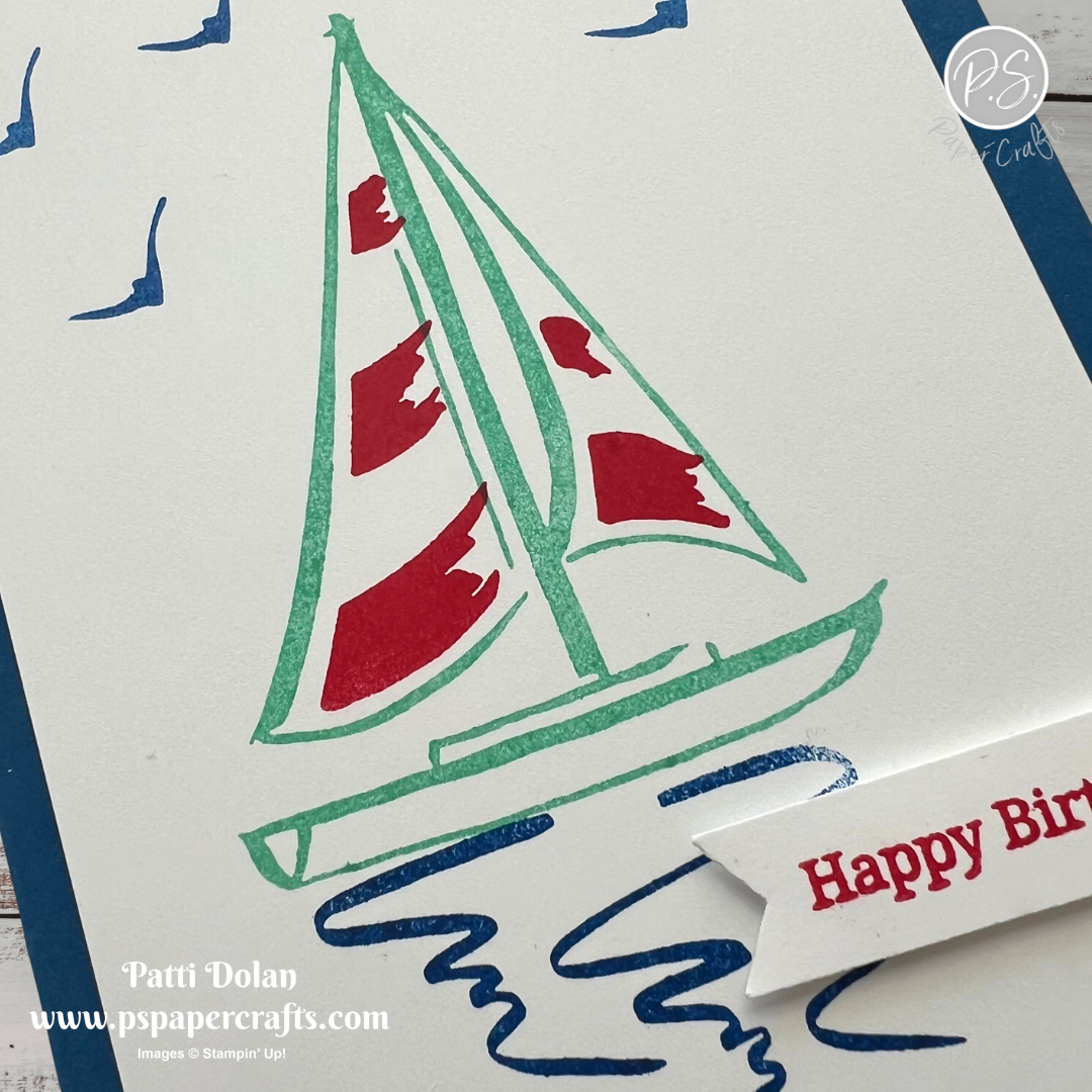 Stamp the sailboat in Coastal Cabana Ink, the sails in Poppy Parade Ink and the water and birds in Blueberry Bushel Ink. Adhere to the card base.