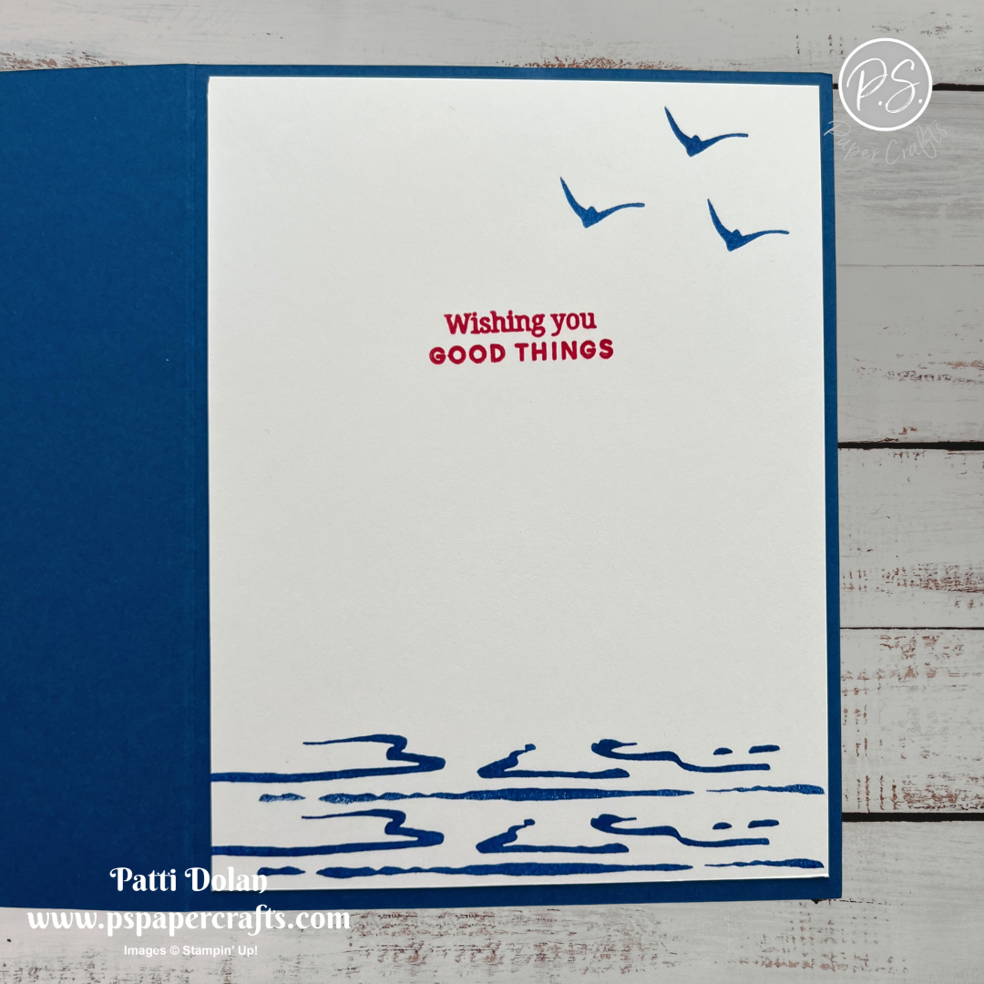 On the inside layer (4 x 5-1/4), stamp sentiment in Poppy Parade Ink. Stamp the water twice and some birds in Blueberry Bushel Ink.