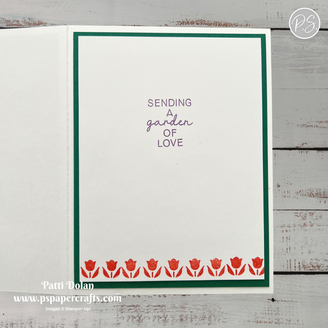 For the inside, adhere a 4 x 5-1/4 piece of Shaded Spruce Cardstock. On a 3-3/4 x 5 piece of Basic White Cardstock, stamp the small tulips across the bottom in Calypso Coral Ink. I stamped them in the middle of the layer and then added just a couple on each side to fill it out. Stamp the sentiment in Gorgeous Grape Ink.