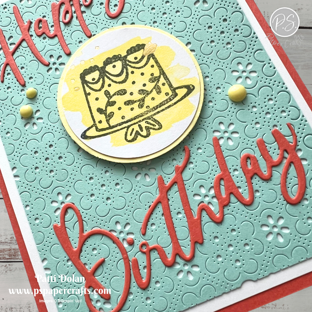 Die cut the Happy and Birthday sentiments from Calypso Coral Cardstock using the Words & Wishes Dies.