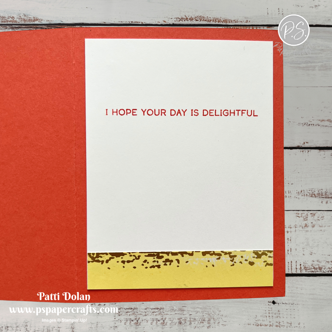 On the inside layer (4 x 5-1/4), stamp the sentiment in Calypso Coral ink and add a 3/4 x 4 strip of the Designer Series Paper to the bottom.
