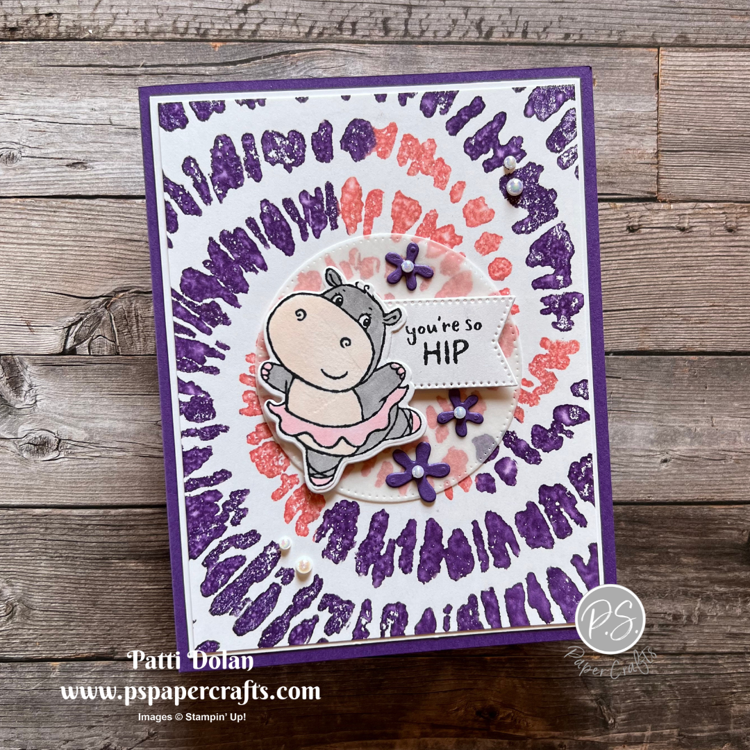 I made this card for my granddaughter’s 5th birthday. She’s a tie dye girl who loves purple and pink and I think she’ll like the cute hippo!